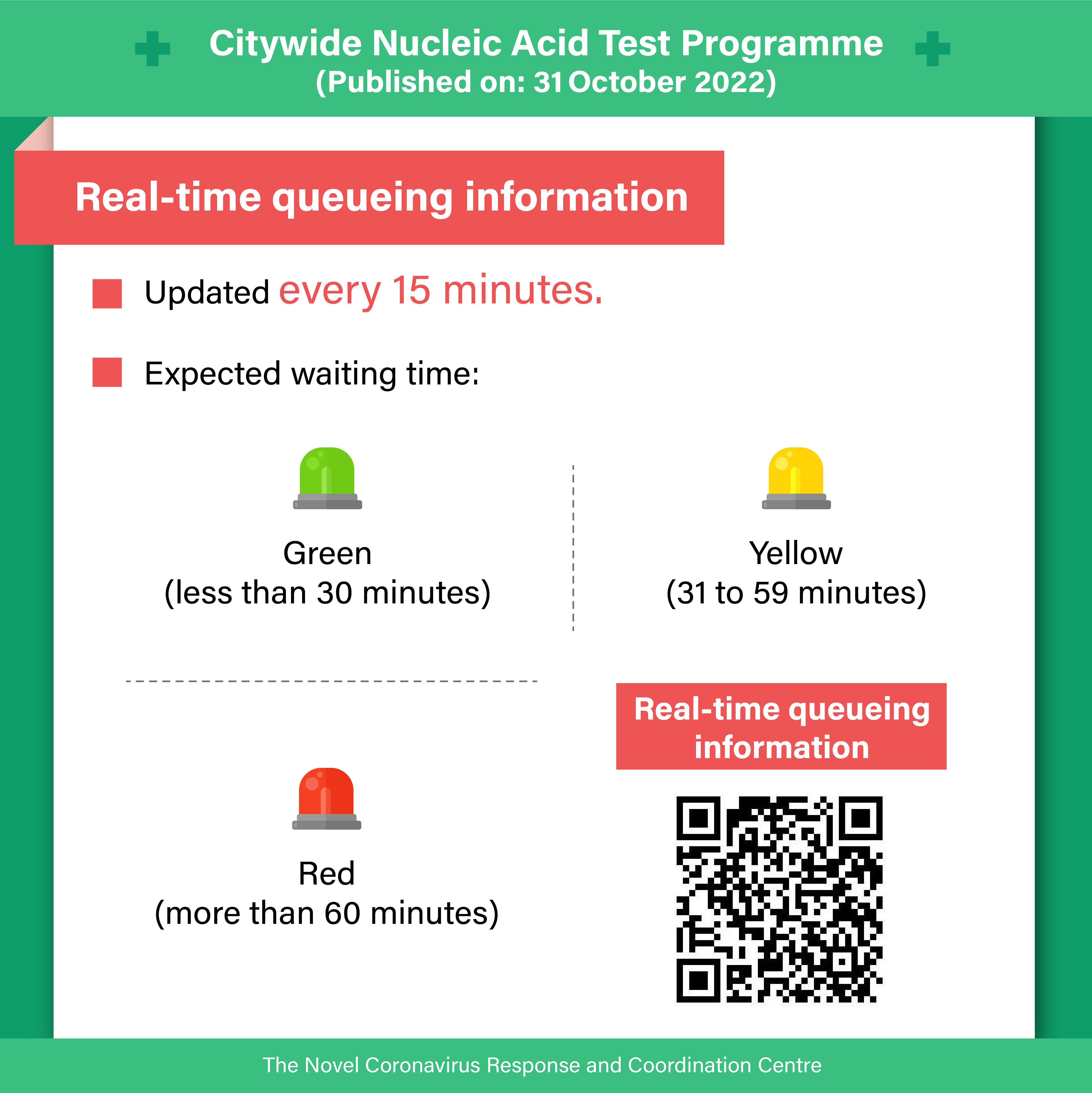 The booking system for citywide NAT operates on the basis of sampling stations to enable accurate capacity management. Real-time waiting information (namely, the number of sampling booths, number of people waiting, expected waiting time, and number of bookings) at different stations will be disseminated 4 times every hour by diversified means. The expected waiting time is shown in three colours: