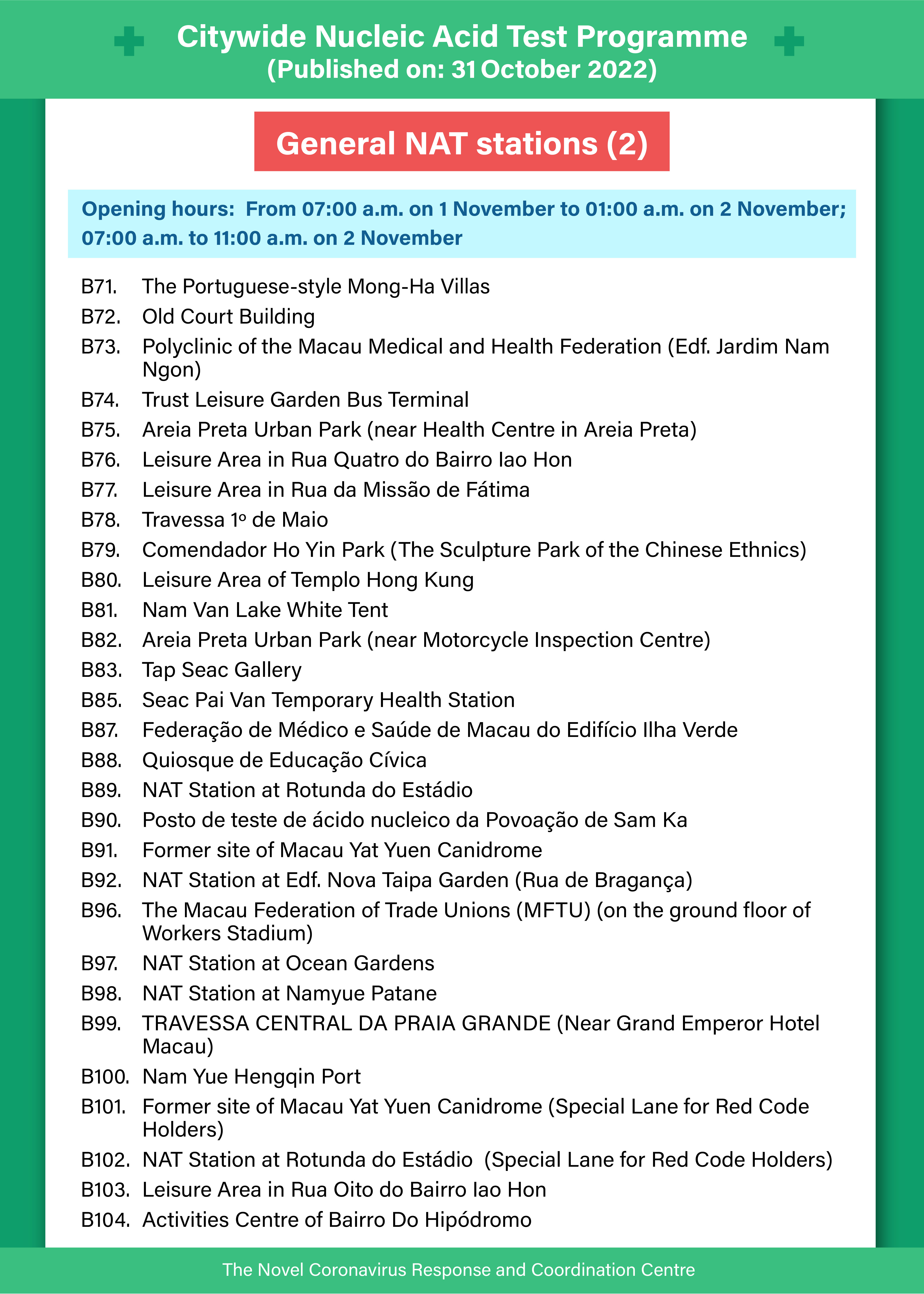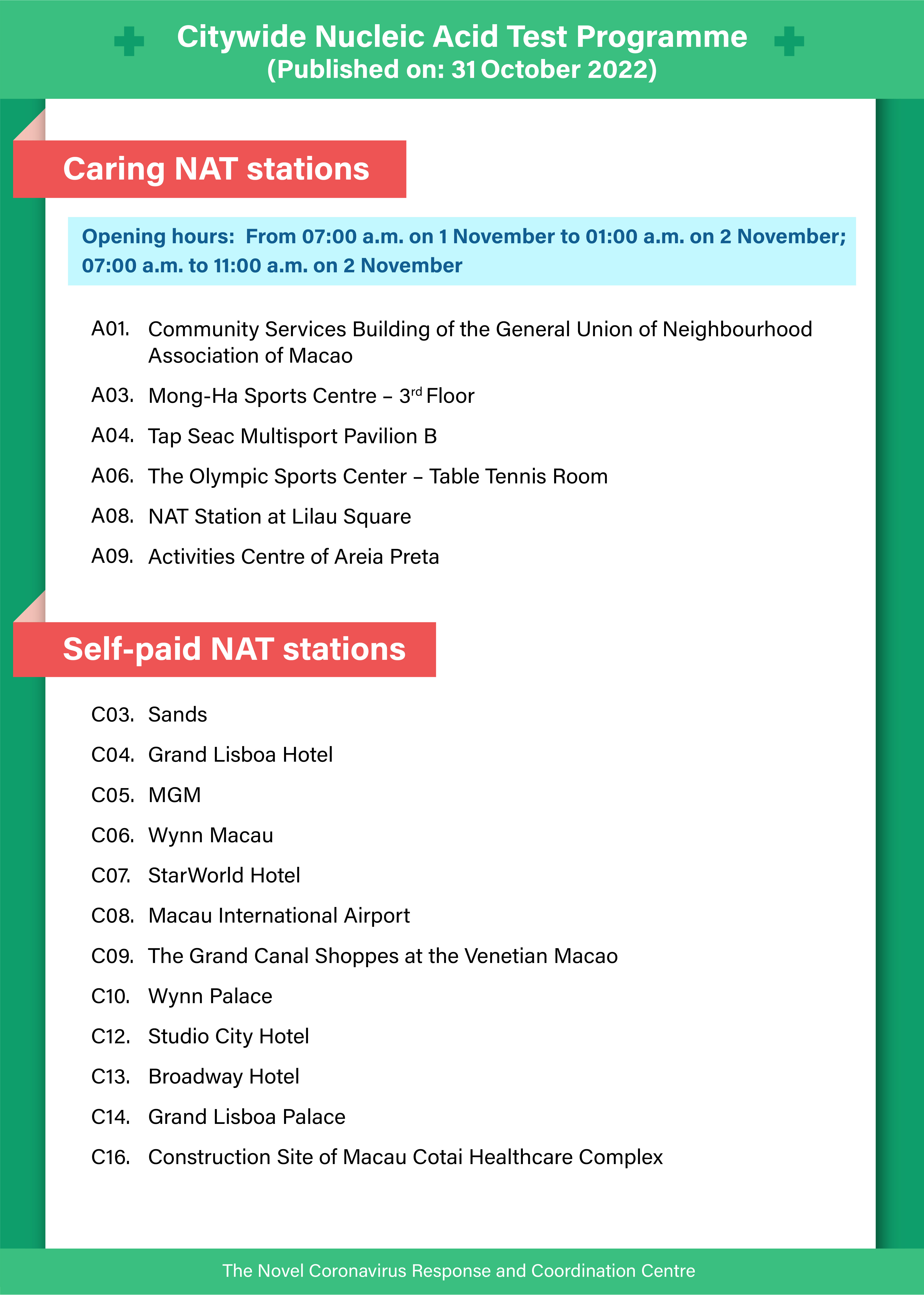 - The appointment system will be put into operation from 21:00 on 31 October. Free test booking link (result cannot be used for border-crossing purposes): https://eservice.ssm.gov.mo/allpeoplernatestbook.