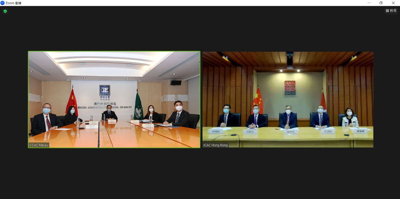Participants of the videoconference also included the Deputy Commissioners of the CCAC, Ao Ieong Seong and Lam In Sang, Chief of the Cabinet of the Commissioner Against Corruption, Chan In Chio, and Head of Operations of the ICAC, Yau Shu Chun.