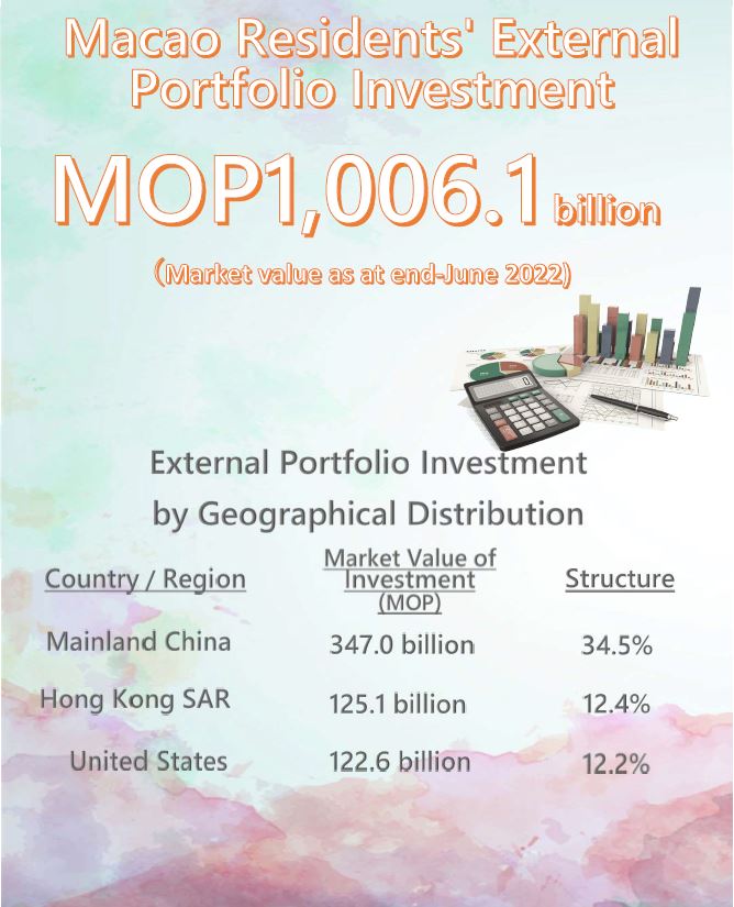 The market value of Macao residents’ portfolio investment in the North Atlantic and Caribbean fell by 7.2% from end-2021 to MOP164.6 billion though its share in total external securities investment increased from 16.2% to 16.4%; the market value of portfolio investment in the British Virgin Islands decreased by 3.3% to MOP83.9 billion.
