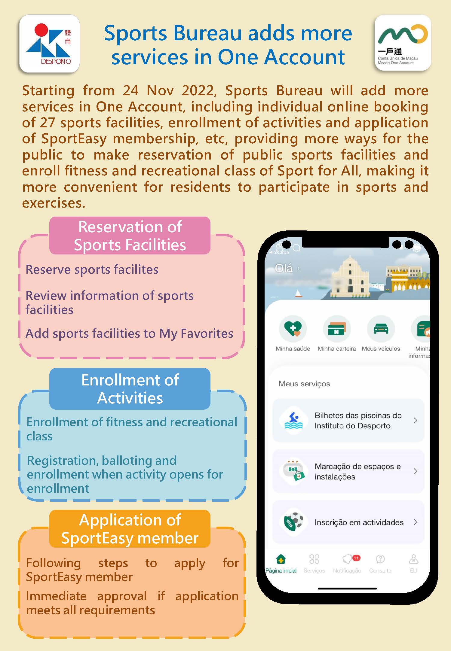 To comply with the development of e-government, starting from 24 Nov 2022, Sports Bureau (ID) will add more services in Macao One Account, including individual online booking of sports facilities, enrollment of activities and application of SportEasy membership, providing more ways for the public to make reservation of public sports facilities and enroll fitness and recreational class of Sport for All. Together with the previously launched “online advanced booking of swimming ticket” and “online purchase of on-the-spot swimming ticket”, these new functions provide more convenience for residents to participate in sports and exercises.