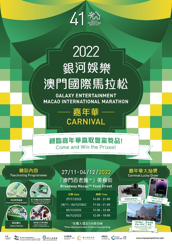 To elevate the atmosphere of the event, the ‘2022 Galaxy Entertainment Macao International Marathon Carnival’ will be held from 27 November to 4 December, featuring display of medals from previous editions, game booths and lucky draws. In addition, sportswear, supplements, medical and health care products will also feature at the Carnival, with shopping discounts on offer. The opening ceremony of the Carnival will be held on 1/F of Broadway Theatre at 1600 on 27 November.