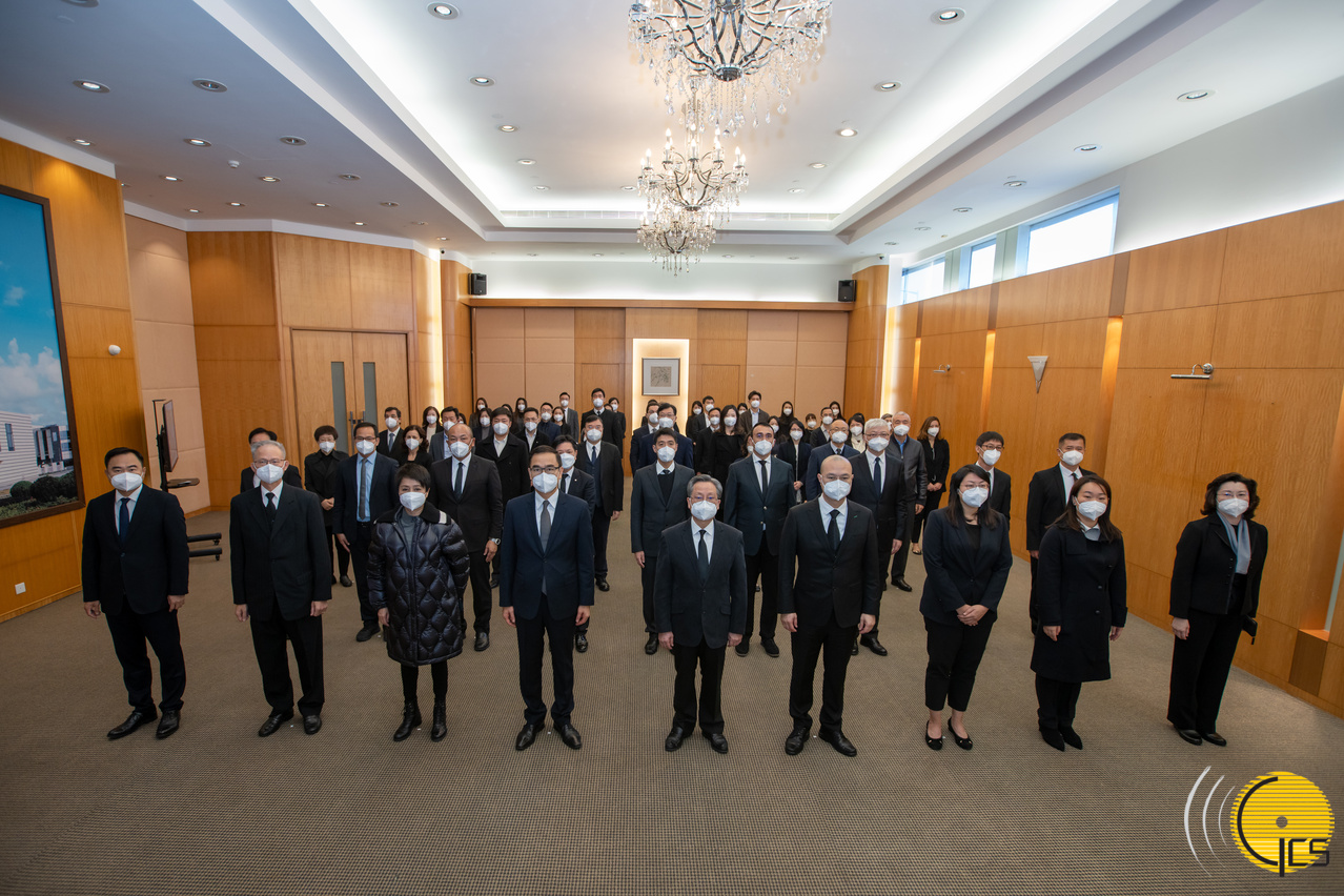 The Chief Executive’s delegation consisted of more than 260 people, including principal officials, members of the Executive Council, and heads of public departments. Each person had a white-flower buttonhole, and all participants watching the live broadcast stood to attention at 10am to observed the three-minute silence in synchrony with the actual ceremony’s proceedings.