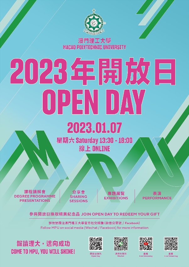 The Macao Polytechnic University (MPU) will hold the MPU 2023 Open Day online on 7 January (Saturday). Featuring degree programme presentations, sharing sessions, thematic exhibitions, performances and a lucky draw, the event will allow the community to have a comprehensive understanding of MPU’s programmes and achievements in teaching and research, and to experience the exciting academic life and diverse campus culture. Secondary school graduates, elites, parents, and interested parties are welcome to join in online.