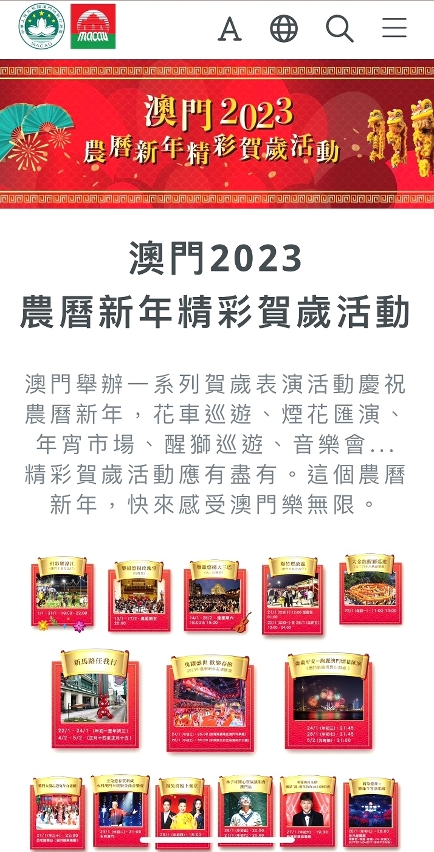 The Spring Festival Golden Week is about to unfold between 21 and 27 January 2023. The outlook is bright for visitor arrivals during the Golden Week with recent easing of Macao’s border measures. Macao Government Tourism Office (MGTO) has been carrying out a variety of preparations to welcome visitors. Great efforts are poured to promote and organize festivities, while more rigorous patrols are conducted. The Office maintains communication with industry operators to safeguard the quality of tourism services. The above endeavors are made so that residents and visitors can enjoy a memorable Chinese New Year and the economy can regain momentum more readily.