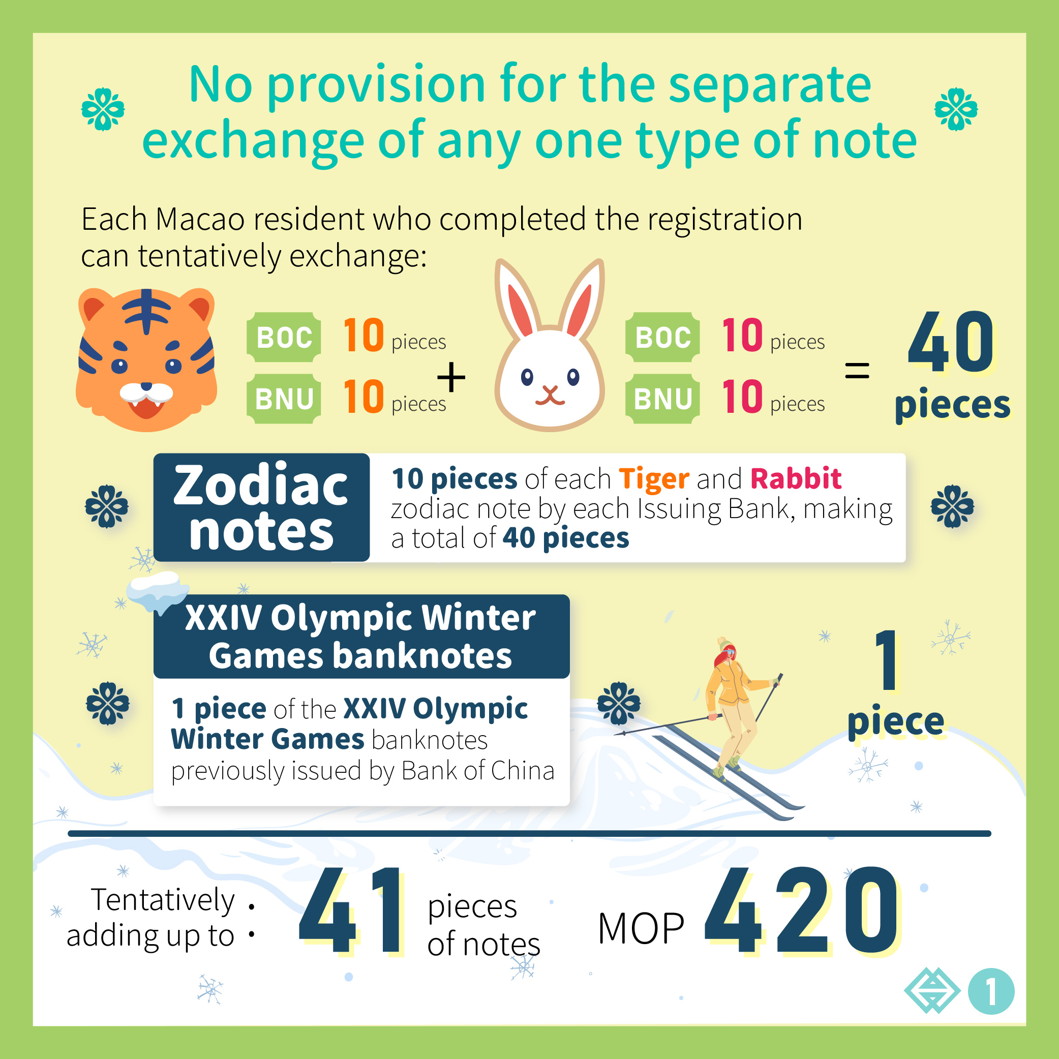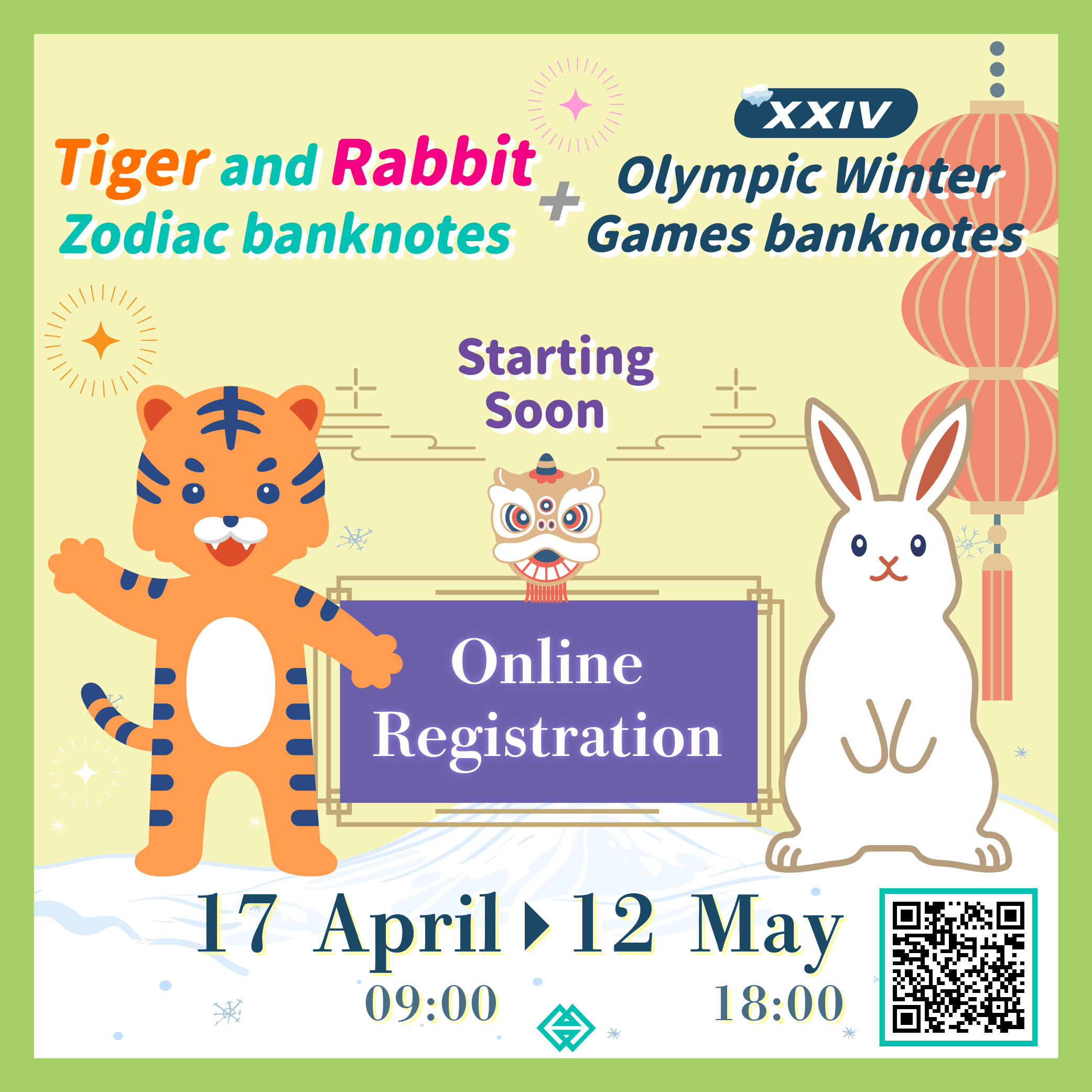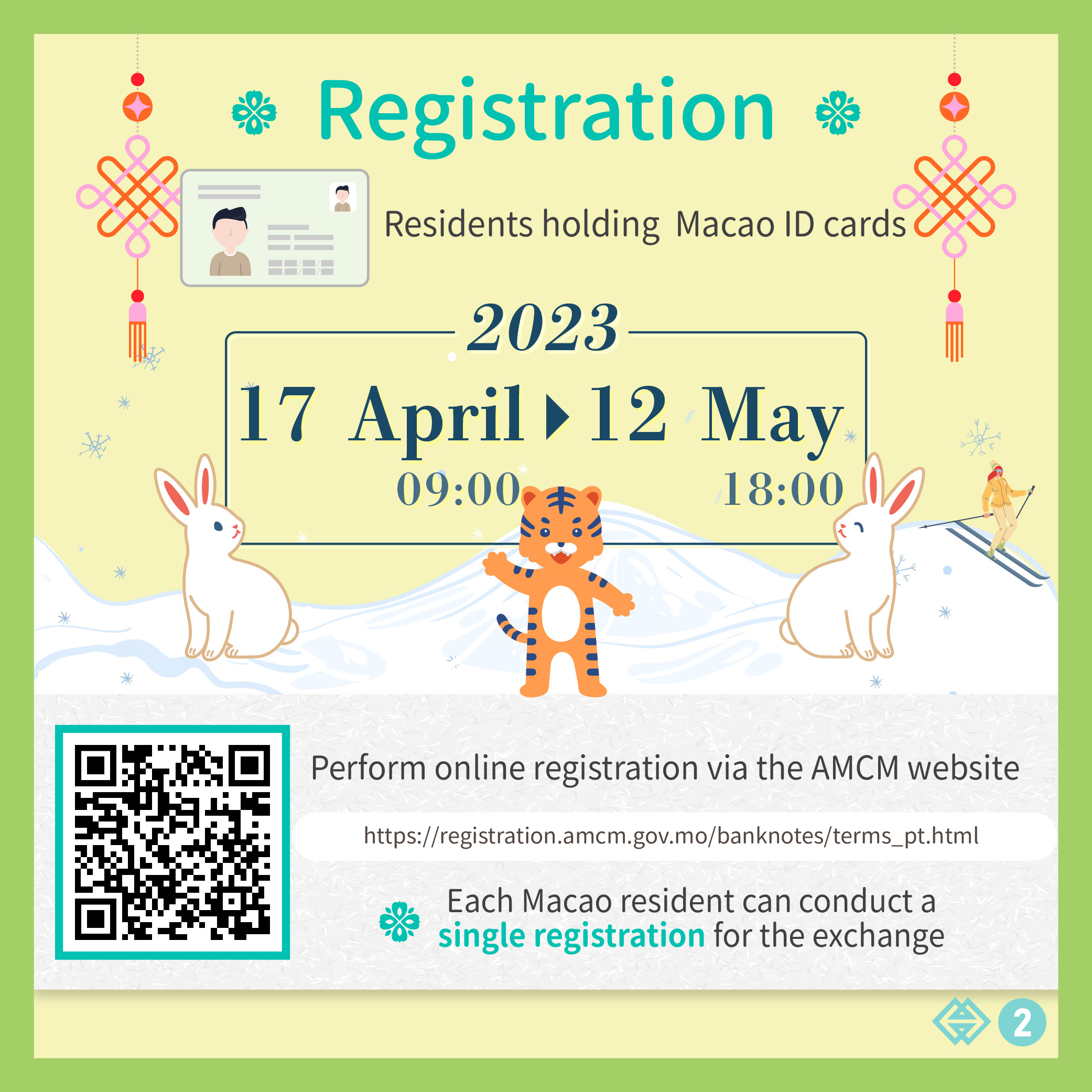 The online registration for the exchange of the Tiger and Rabbit Zodiac banknotes and the previously issued XXIV Olympic Winter Games banknotes will commence at 9:00 am on 17 April 2023. Each Macao resident can conduct a single registration for the exchange via the Authority’s website, and the registration will end at 6:00 pm on 12 May 2023.