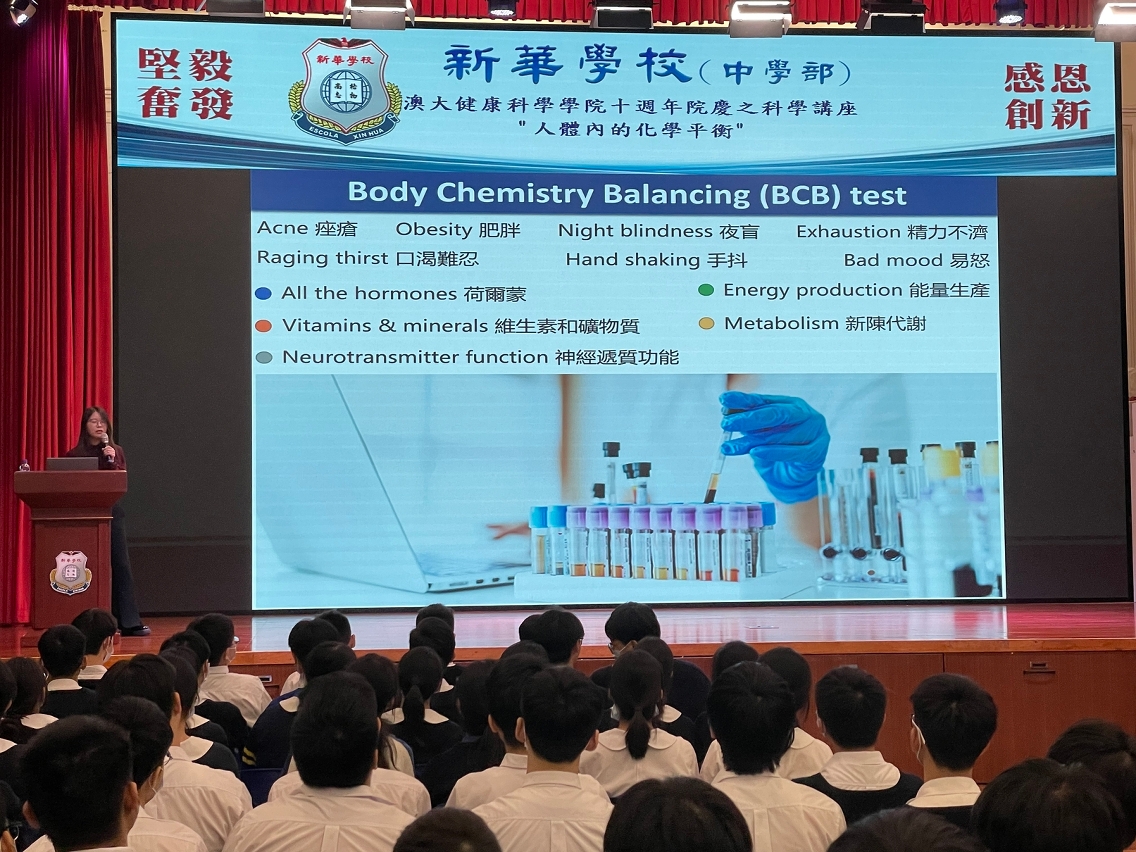 On the occasion of the tenth anniversary of the University of Macau (UM) Faculty of Health Sciences (FHS), Associate Professor Tam Kin Yip and Research Assistant Professor Li Bei in the FHS gave talks on ‘Pharmaceutical Century – Ten Decades of Drug Discovery’ and ‘Body Chemistry Balance’, respectively, to over 300 students at Xin Hua School to enrich their knowledge and broaden their horizons in science.