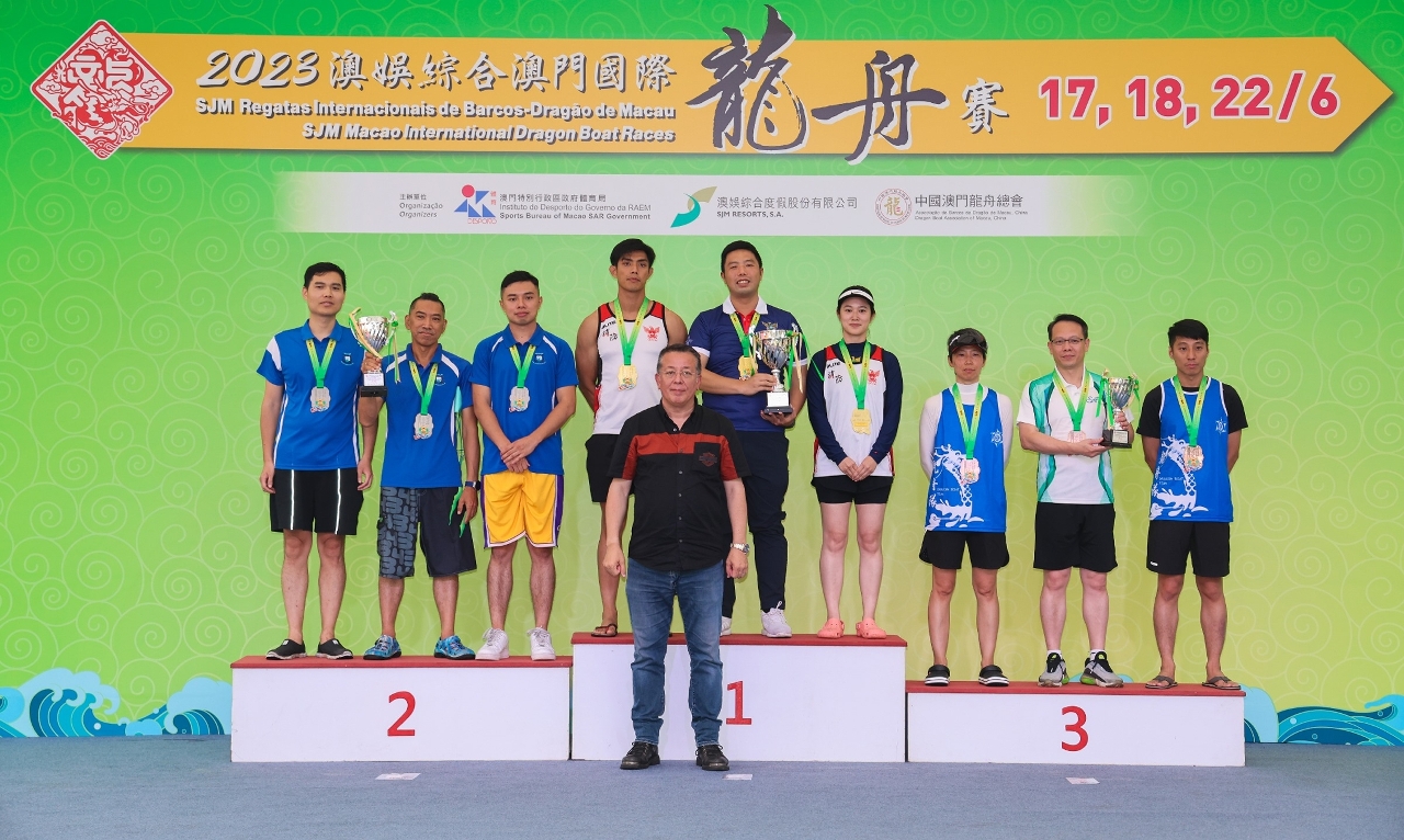 The guests officiating at the prize ceremony included Pun Weng Kun, President of the Sports Bureau; Angela Leong, Director of SJM Resorts, S.A.; Lai Pak Leng, Chairman of the Dragon Boat Association of Macao, China; José Tavares, Chairman of the Administration Committee on Municipal Affairs of the Municipal Affairs Bureau; Vong Ka Hou, President of the Dragon Boat Association of Macao, China; Chio Man Tou and Lok Nam Tak, members of the Sports Committee.