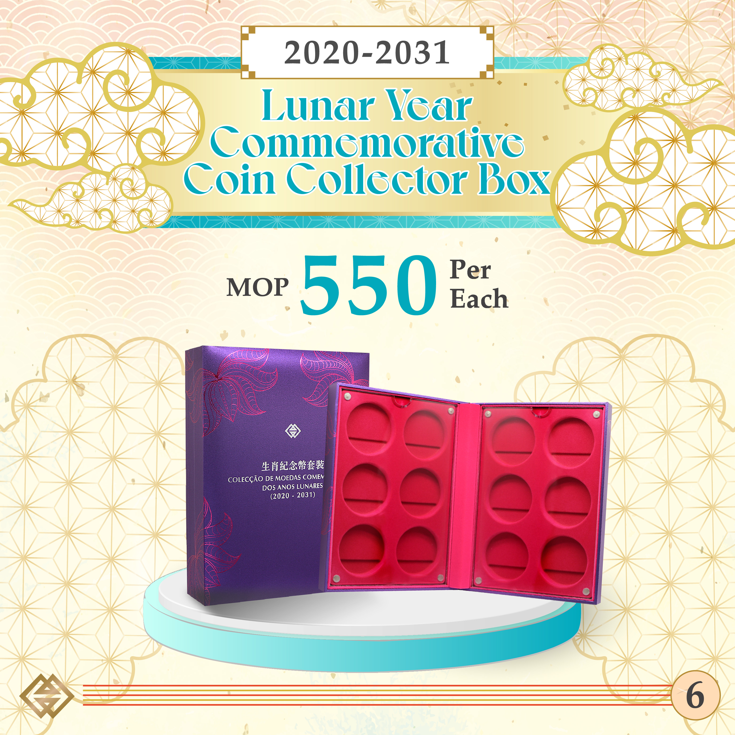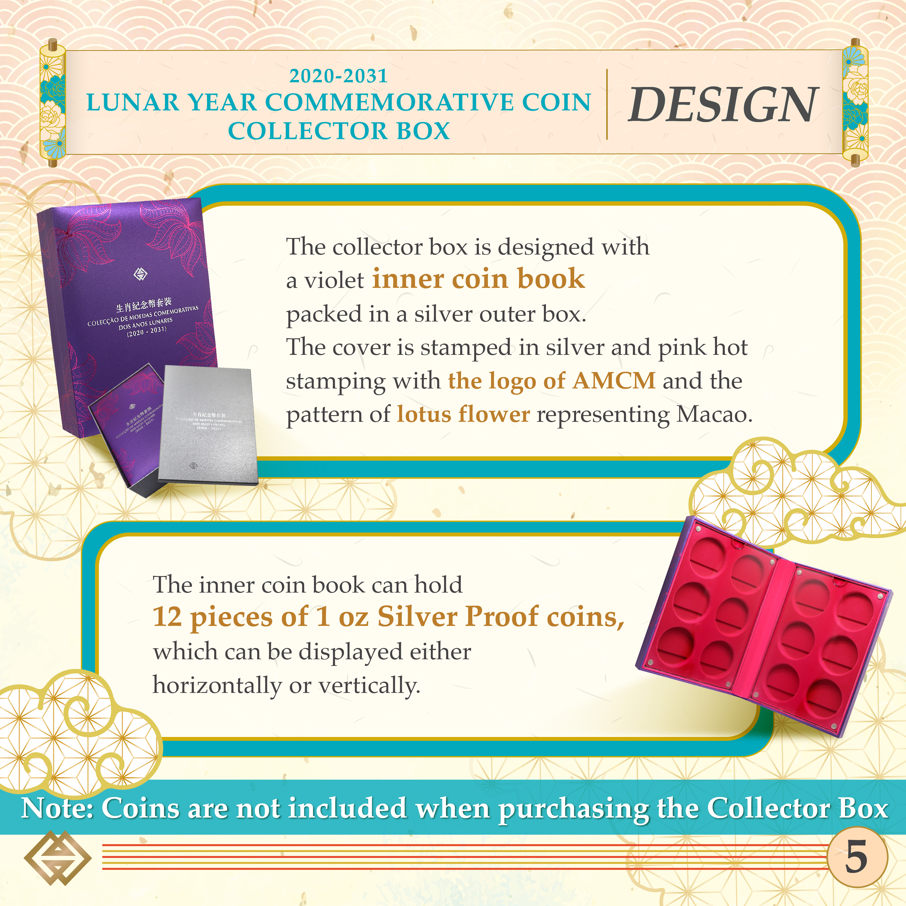 The collector box is designed with a violet inner coin book packed in a silver outer box. The cover bears in silver and pink hot stamping with the logo of AMCM and the pattern of lotus flower representing Macao. The inner coin book can be displayed either horizontally or vertically. The selling price of each collector box is MOP550.