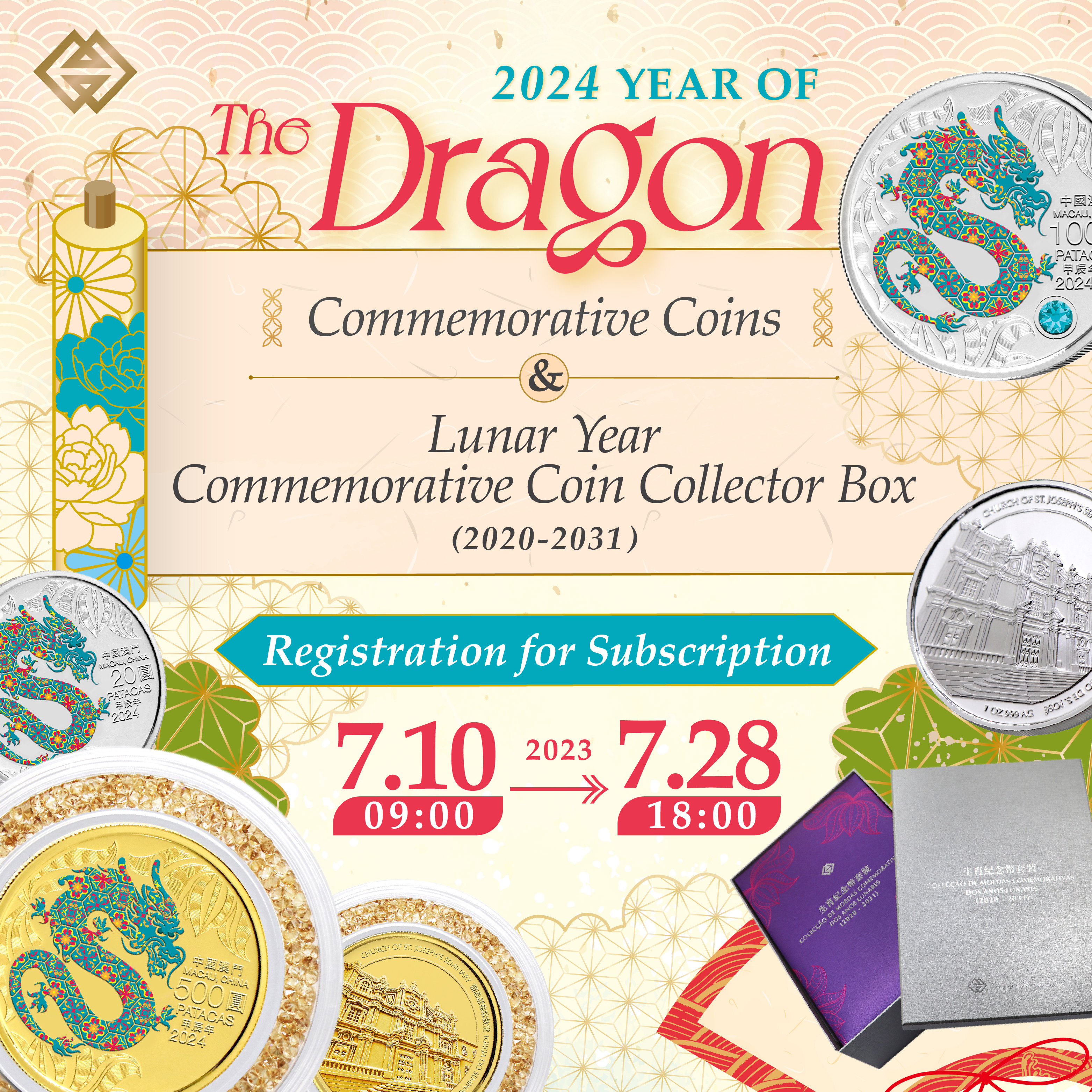 The Monetary Authority of Macao (AMCM) will be launching 2024 Year of the Dragon commemorative coins and online registration for the subscription will start on next Monday (10 July 2023). At the same time, the Lunar New Year Commemorative Coin Collector Box (2020-2031) will be launched for citizens who are interested in collecting a total of 12 pieces of 1 oz Silver Proof coins of the current series.