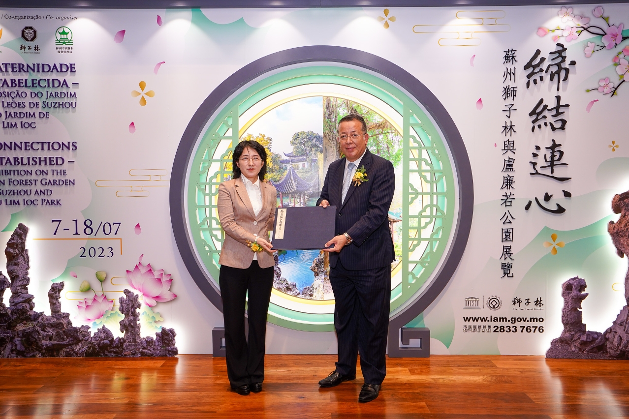 “Connections Established – Exhibition on Lion Forest Garden in Suzhou and Lou Lim Ioc Park in Macao” is held with the support of the Liaison Office of the Central People's Government in the Macao SAR and the Hong Kong and Macao Affairs Office of Suzhou Municipal People’s Office to advance the exchange between Suzhou and Macao and jointly promote excellent Chinese traditional culture. The opening ceremony of the exhibition was held today (7 July) in Chon Chou Tong Pavilion in Lou Lim Ioc Park. Huang Huagai, Deputy Secretary-General and Director of the Department of Social Affairs of the Liaison Office of the Central People's Government in the Macao SAR, José Tavares, Chairman of the Administration Committee on Municipal Affairs of IAM, Han Libo, Deputy Director of the Gardening and Greening Bureau of Suzhou and other guests attended the ceremony. The scenery of Lion Forest Garden in Suzhou is showcased in videos, pictures and texts. Miniature models, calligraphy and paintings are also displayed so that the public can experience the elegance of the Classical Gardens of Suzhou.