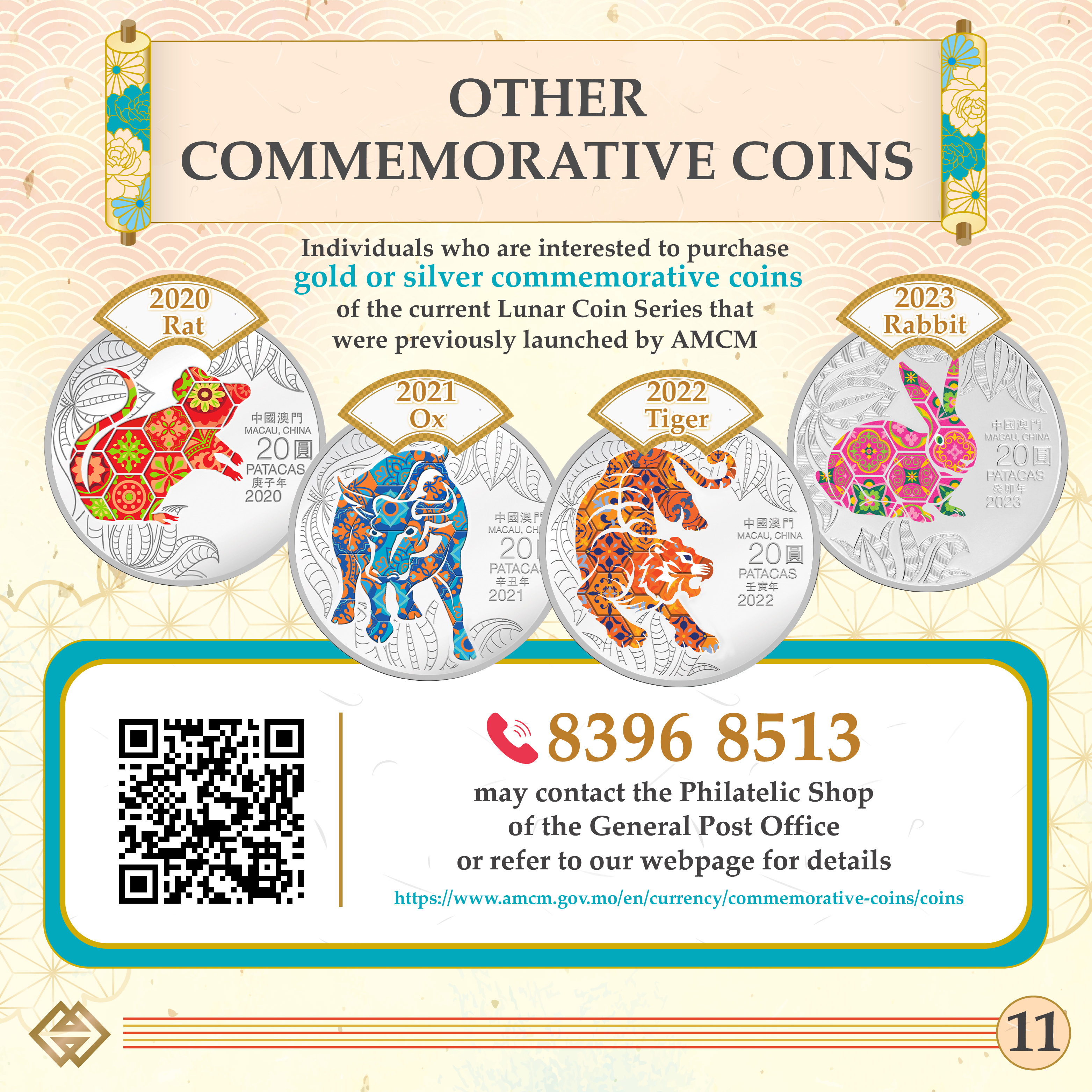Individuals who are interested to purchase Gold or Silver Proof coins of the current Lunar Commemorative Coin Series that were previously launched by AMCM, may contact the Philatelic Shop of the General Post Office for details (Tel.: 83968513), or refer to our webpage (https://www.amcm.gov.mo/en/currency/commemorative-coins/coins) for details.
