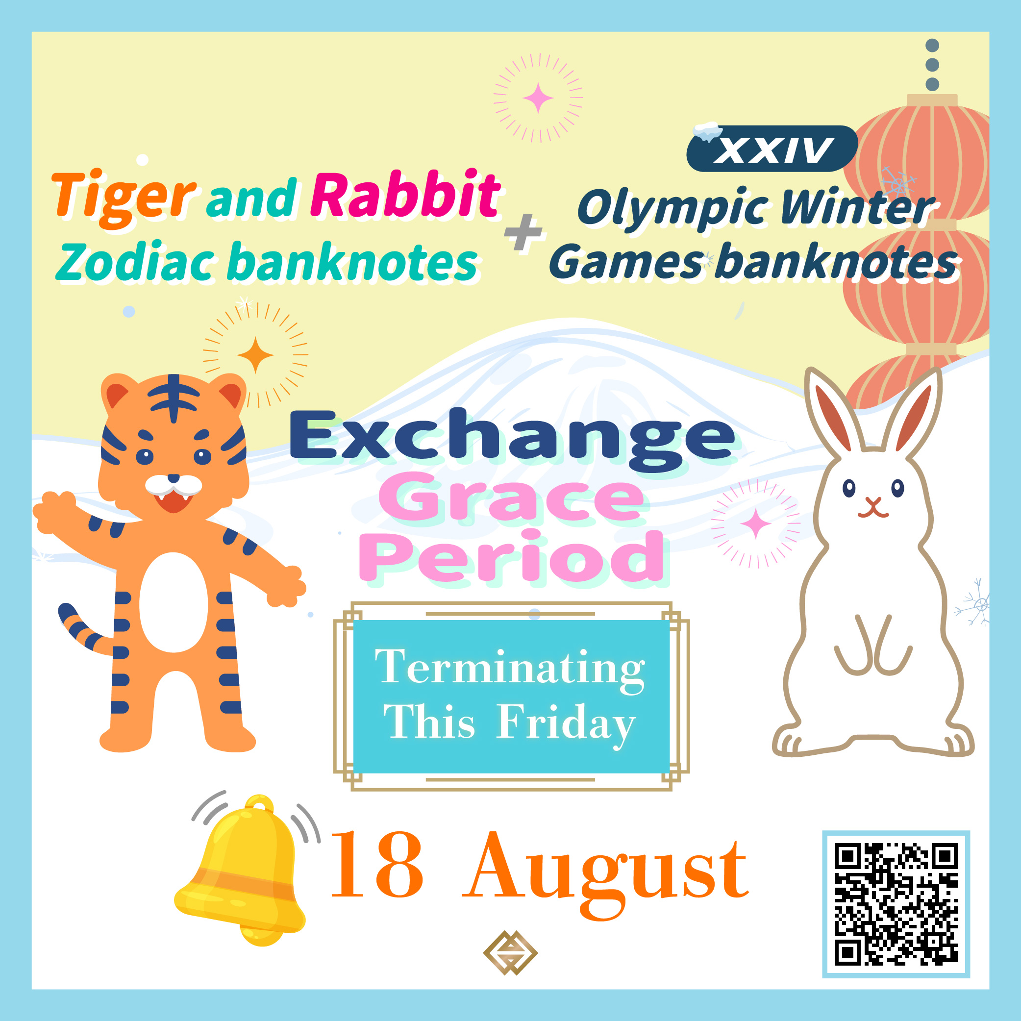 The grace period for the Tiger and Rabbit Zodiac banknotes and the previously issued XXIV Olympic Winter Games banknotes will end on 18 August 2023 (Friday). The Monetary Authority of Macao would like to remind those registrants who have not yet conducted the note exchange to exchange for their subscribed notes at their previously selected bank on or before this Friday.