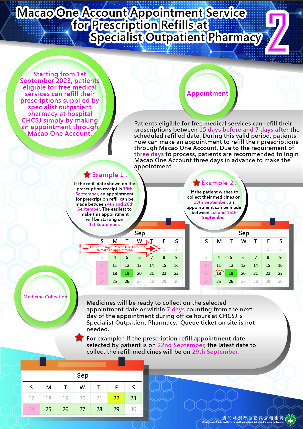In light of the development of SAR Government’s e-services, the promotion of smart healthcare system, and the enhancement of patients’ experience in collecting medicines from specialist outpatient pharmacy at hospital CHCSJ in terms of shortening waiting times, the Health Bureau will launch the Macao One Account appointment service for prescription refill at the Specialist Outpatient Pharmacy on 1st September 2023. As a result, patients eligible for free medical services (patients) can make prescription refill appointments simply by using the Macao One Account. Details are as follows: