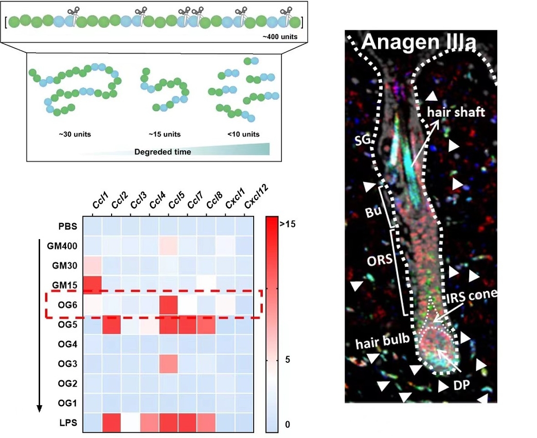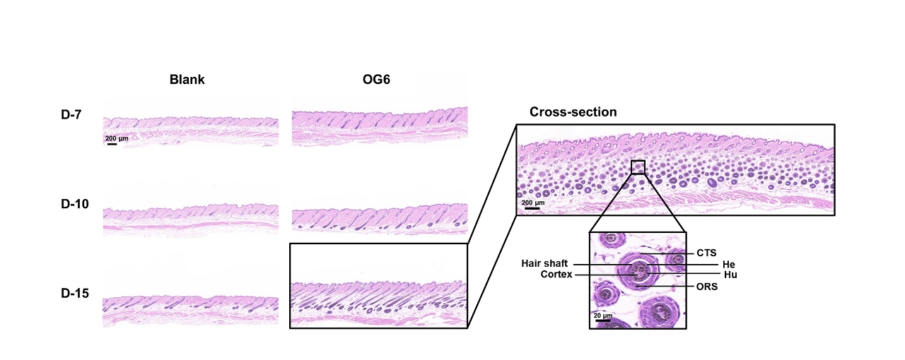 According to Prof Wang, mammalian hair grows from hair follicles (HFs) and hair growth is cyclical, with the transition from ‘anagen’ (growth) to ‘telogen’ (rest) phases being regulated by the physiological microenvironment of the local tissues. Changes in the number of certain immune cells or the concentration of specific cytokines can stimulate HF growth, but such changes are difficult to control precisely. In the study, the team optimised an enzyme, which acts like a pair of scissors, to ‘cut’ the large molecules from natural plant-derived glucomannan polysaccharides into smaller oligosaccharides, from which the researchers identified a fraction called OG6. OG6 can specifically induce specific cells in the skin to release a signal called CCL5. The signal acts like a traffic light and leads a type of immune cells called regulatory T cells to migrate towards HFs, interact with the stem cells around HFs, and stimulate HFs to enter the anagen phase. It is interesting to note that neither the large molecules that serve as source material nor the other small fractions obtained from the cutting possess this specific function of OG6. The team speculated that the cutting exposes the ‘hidden activity’ of the oligosaccharides, which is concealed by the polysaccharide chain. After verifying the molecular mechanism of OG6 with multiple biological methodologies, they injected OG6 into the dermal tissue of wild-type and transgenic mice whose hair had been shaved and observed that healthy hairs grew rapidly in situ without skin allergies or toxic side effects. More importantly, OG6 is a safe substance as its final degradation products are glucose and mannose, which are already present in the human body.