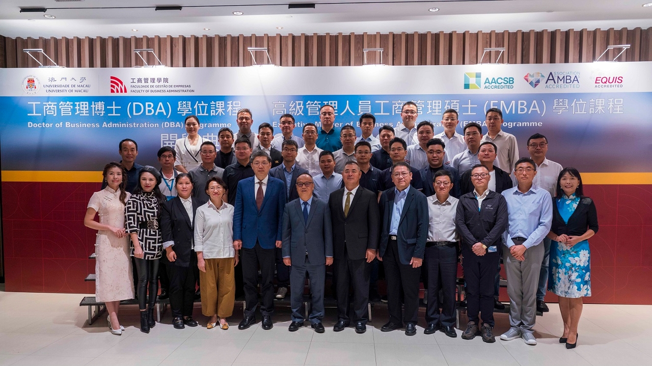 The Faculty of Business Administration (FBA) of the University of Macau (UM) held an opening ceremony for the 2023/2024 intake of the Doctor of Business Administration (DBA) programme and the Executive Master of Business Administration (EMBA) programme. The two programmes have admitted more than 60 business elites from Macao and mainland China for the new academic year.