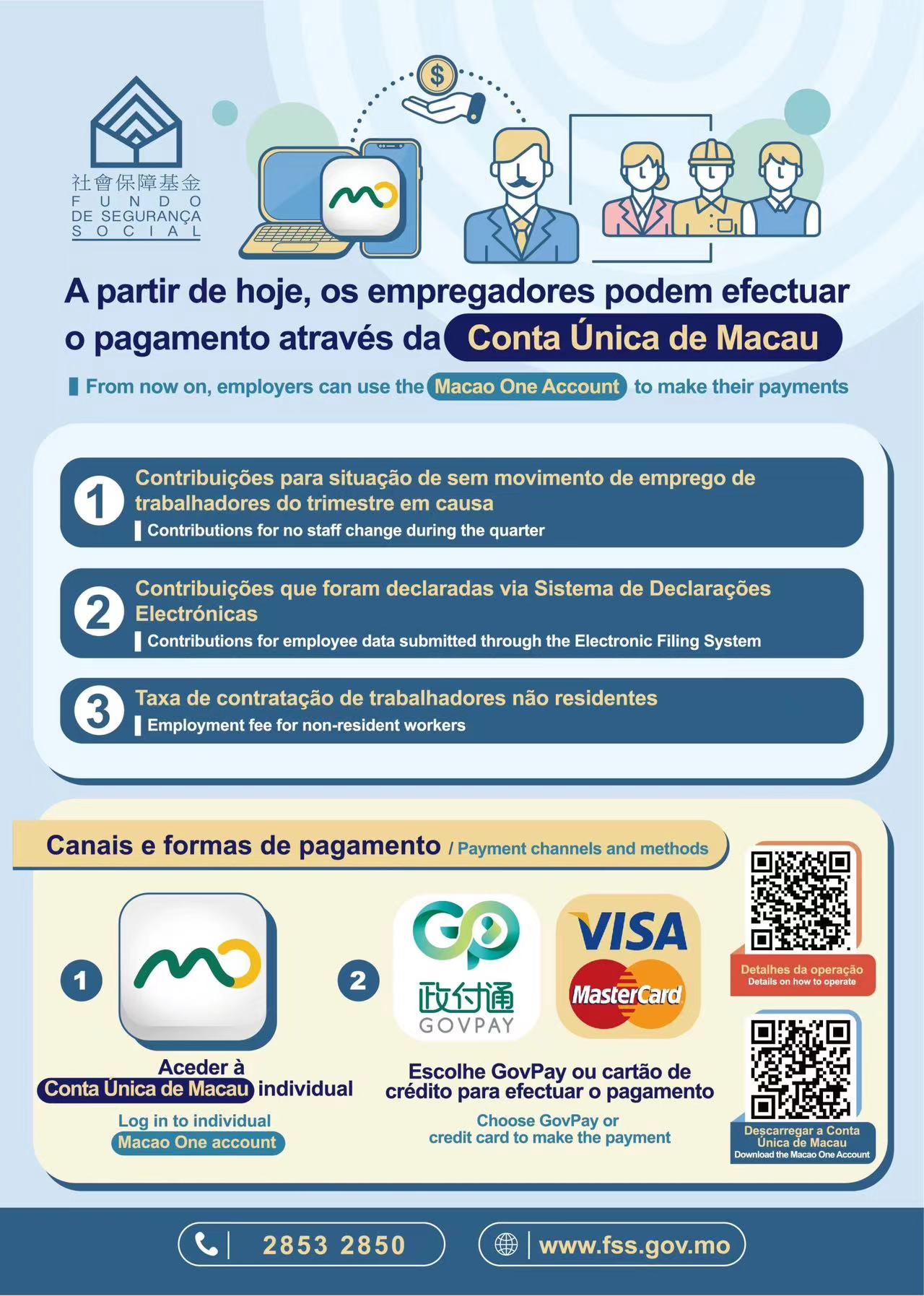 In addition to the “Macao One Account”, beneficiaries of the arbitrary system may also pay through electronic payment channels such as the designated banks’ electronic channels and payment counters, JETCO network ATMs, self-service machines with the FSS’s contribution logo on them.