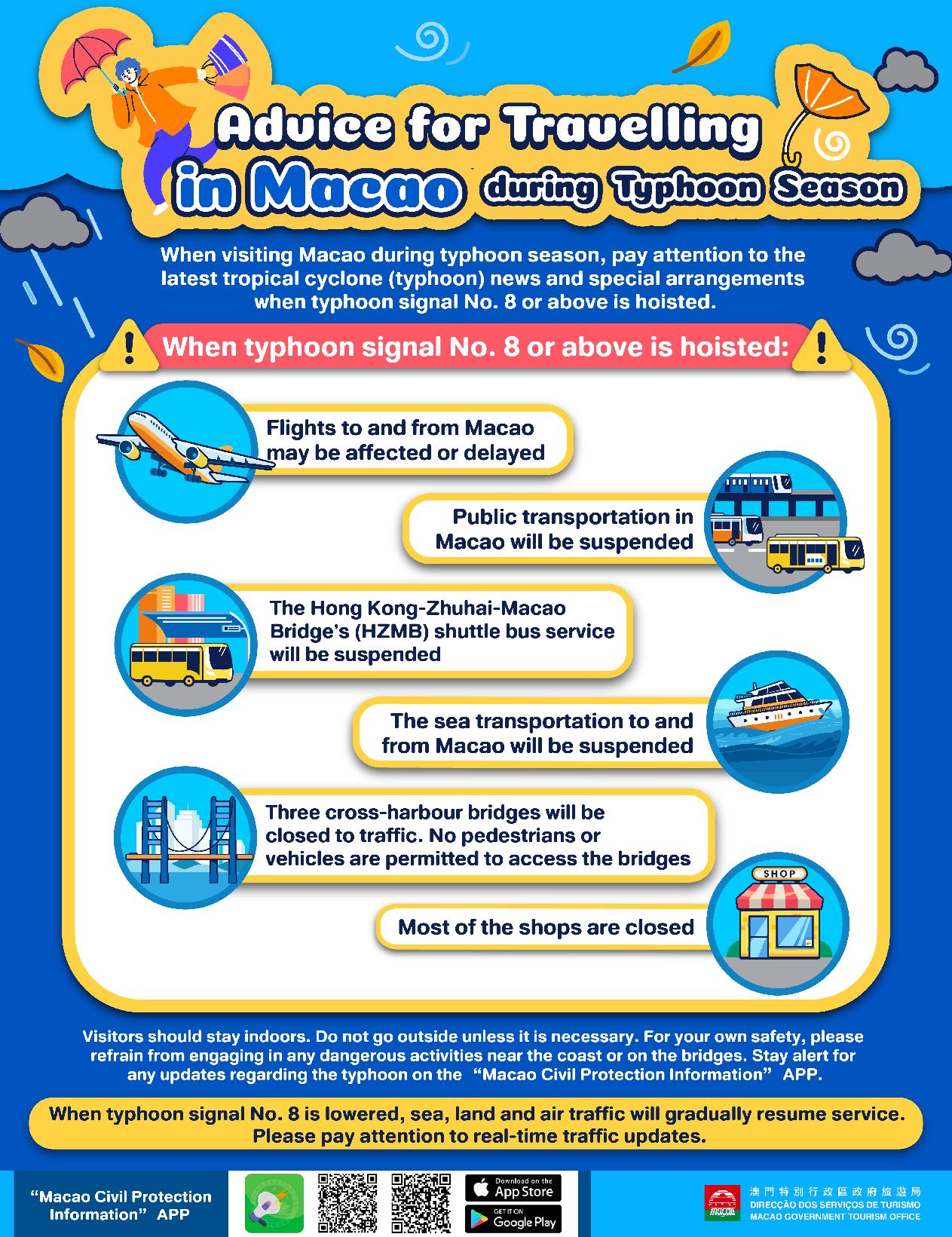 During the time when the typhoon signal No. 8 or above is hoisted, MGTO will maintain the 24-hour operator service of the Tourism Hotline (2833 3000). Operations of the Office’s Tourist Information counters are suspended, while the Macao Grand Prix Museum and Ritz Building are closed temporarily.