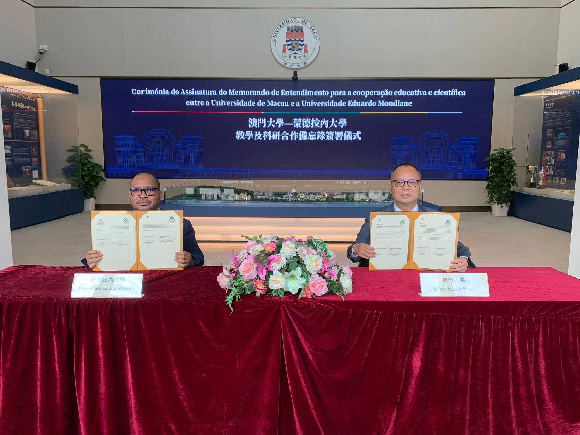 The delegation, together with Aurélio Chiconela, counsellor of the Consulate-General of Mozambique in Macao, was warmly received by UM Rector Yonghua Song, Vice Rector Rui Martins, and Dean of the Faculty of Law Tong Io Cheng. Song and Manuel Guilherme Júnior signed a memorandum of understanding and agreed to enhance cooperation and exchanges in areas including academic and research development, talent cultivation, and mutual visits.