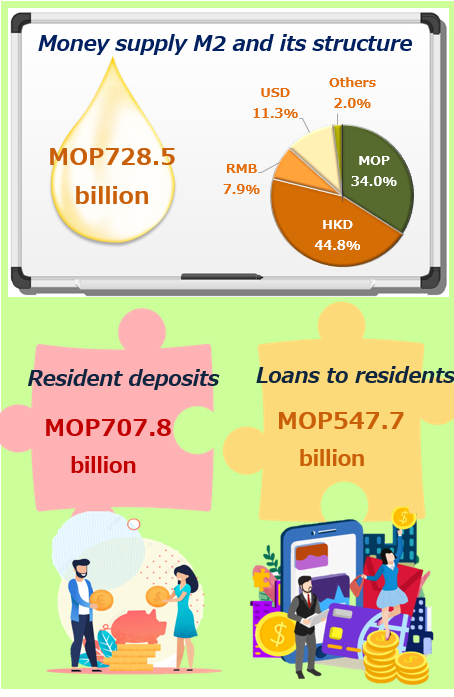 Currency in circulation and demand deposits increased 0.2% and 1.5% respectively. M1 thus rebounded 1.1% from one month earlier. Meanwhile, quasi-monetary liabilities edged up 0.1%. The sum of these two items, i.e. M2, grew 0.2% to MOP728.5 billion. On an annual basis, M1 kept virtually stable while M2 rose 7.0%. The shares of pataca (MOP), Hong Kong dollar (HKD), renminbi (RMB) and United States dollar (USD) in M2 were 34.0%, 44.8%, 7.9% and 11.3% respectively.