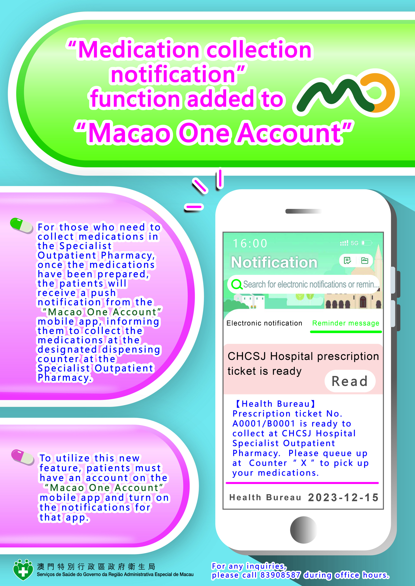 In line with the development of e-governance and the advancement of smart healthcare, and to enhance the patient experience for medication collection services, the Specialist Outpatient Pharmacy of Conde de São Januário General Hospital (CHCSJ) of the Health Bureau has introduced a push notification function on the “Macao One Account” to notify patients when it is their turn to collect their medications. Details are as follows: