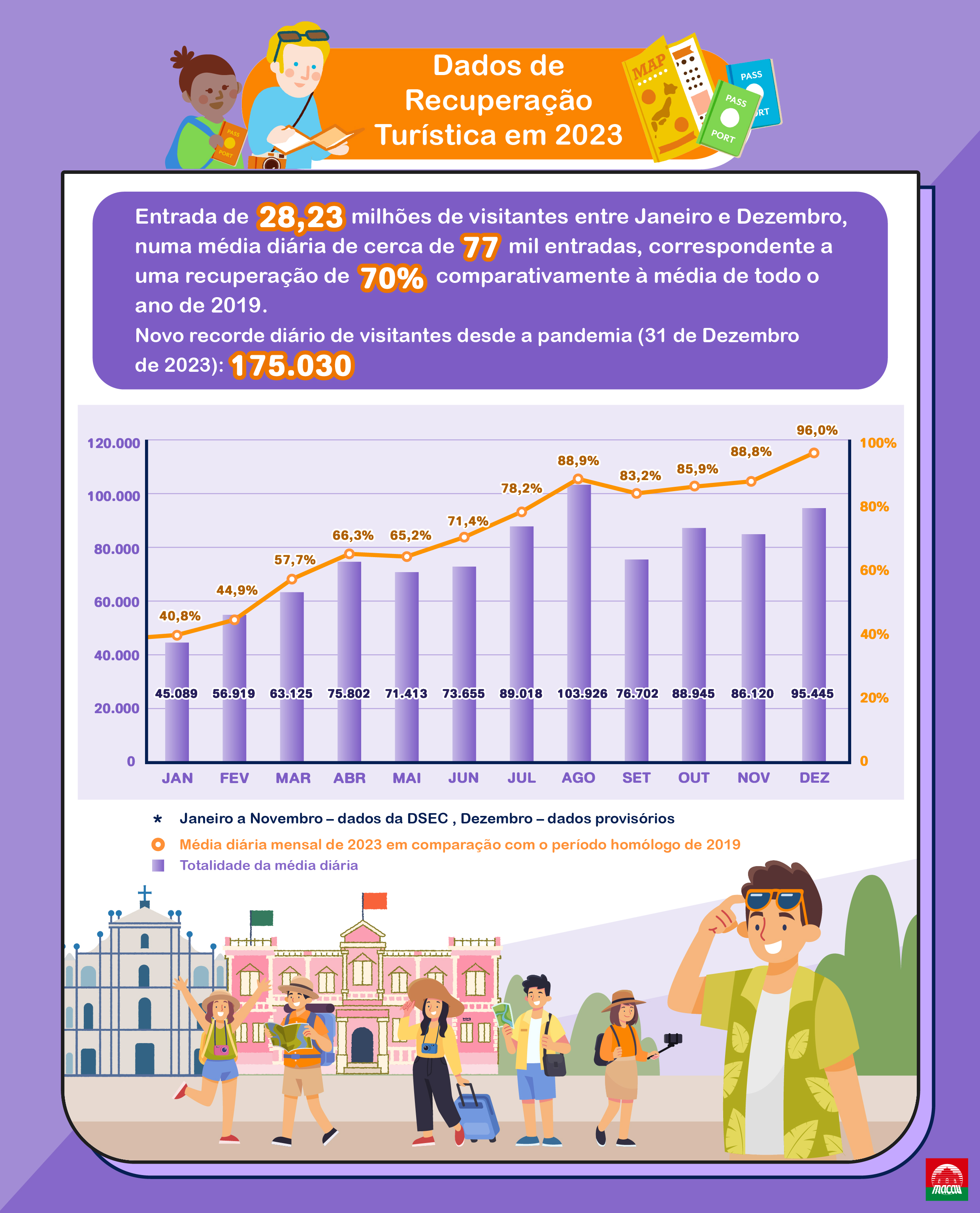 Provisional statistics indicate an approximate total of 28.23 million visitor arrivals in Macao in 2023 and an average daily volume of 77,000 visitors, rebounding to 70% of the levels in 2019. On New Year’s Eve yesterday (31 December 2023), the number of visitors reached 175,030, the highest single-day record in 2023 and since after the pandemic.