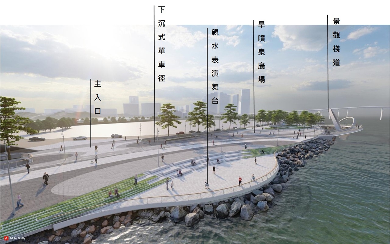 Taking advantage of the coastal features of the leisure area, different spaces for viewing the waterfront will be set up, including a central square and viewing platforms. The upper level platform will be connected to the bicycle bridge, while the lower level will mainly consist of multipurpose space/ commercial space and outdoor waterfront platform. Dining spaces and viewing platforms will also be set up in the eastern tip of the area. Fishing areas will be installed in suitable waterfront locations. The project lets the public get closer to the waterfront and expands the space where the public can spend their leisure time on the waterfront and view the beautiful coastal scenery of Macao.