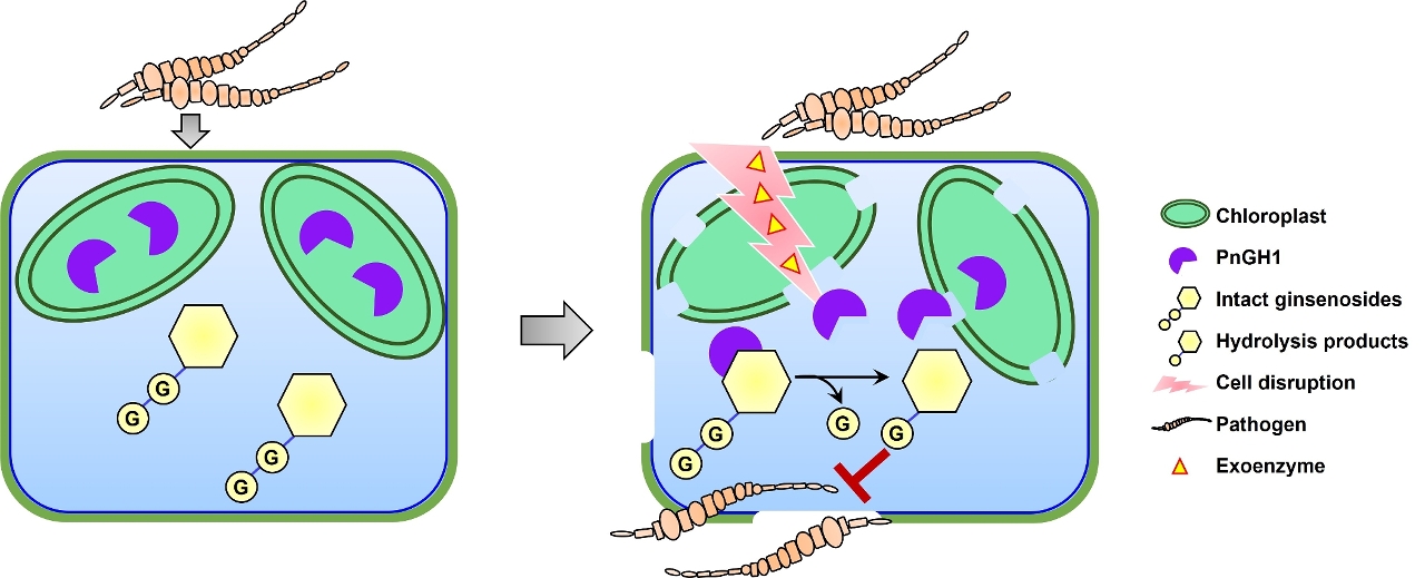 Plants produce secondary metabolites as a response to various environmental threats, enabling them to adapt and play a crucial role in chemical defence. The research originated from unexpected findings during a quality control study of Panax notoginseng leaves. After meticulous investigations, the research team unveiled a two-component chemical defence system in Panax notoginseng leaves. The system comprises a chloroplast-localised β-glucosidase, PnGH1, and its substrates, 20(S)-protopanaxadiol ginsenosides. The β-glucosidase and its substrates are spatially separated in cells under physiological conditions. Ginsenoside hydrolysis is activated only when exoenzymes produced by pathogenic fungi disrupt the plant’s chloroplast. The activation of PnGH1-mediated hydrolysis produces a series of less-polar ginsenosides through selective hydrolysis of outer glucose at the C-3 site. These newly formed ginsenosides exhibit a broader spectrum and more potent antifungal activity. The researchers also found a similar two-component chemical defence system in other Panax species, such as ginseng (P. ginseng), and American ginseng (P. quinquefolium). These findings shed light on the development of botanical pesticides and are hoped to reduce reliance on chemical pesticides in the cultivation of Panax species, thus contributing to the advancement of research in traditional Chinese medicine and the sustainable development of the industry.