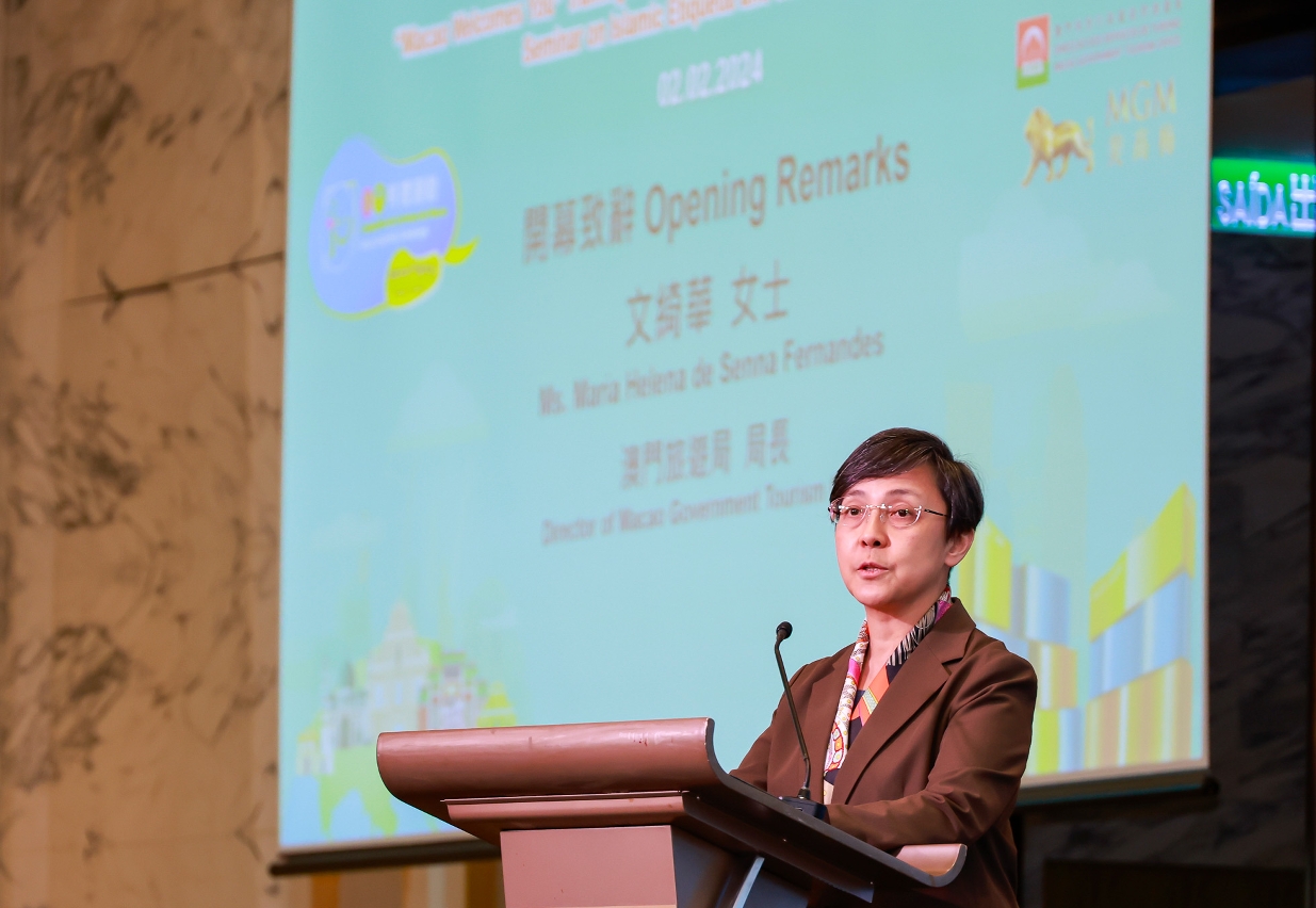 The “Macao Welcomes You” Training Programs for International Guests Launch Ceremony and the first seminar — Seminar on Islamic Etiquette and Cultural Customs were held today (2 February), attended by over 500 participants and guests including MGTO Director Maria Helena de Senna Fernandes, Senior Vice President of Hospitality of MGM China, Iwan Dietschi, Imam of Islamic Association of Macau, Ding Shao Jie, and Managing Director of 3 Hani Enterprises Ltd., Sharifa Leung, as well as representatives of the supporting entities for the Quality Tourism Services Accreditation Scheme (QTSAS), business representatives and employees in the tourism and related industries, as well as students from academic institutions.