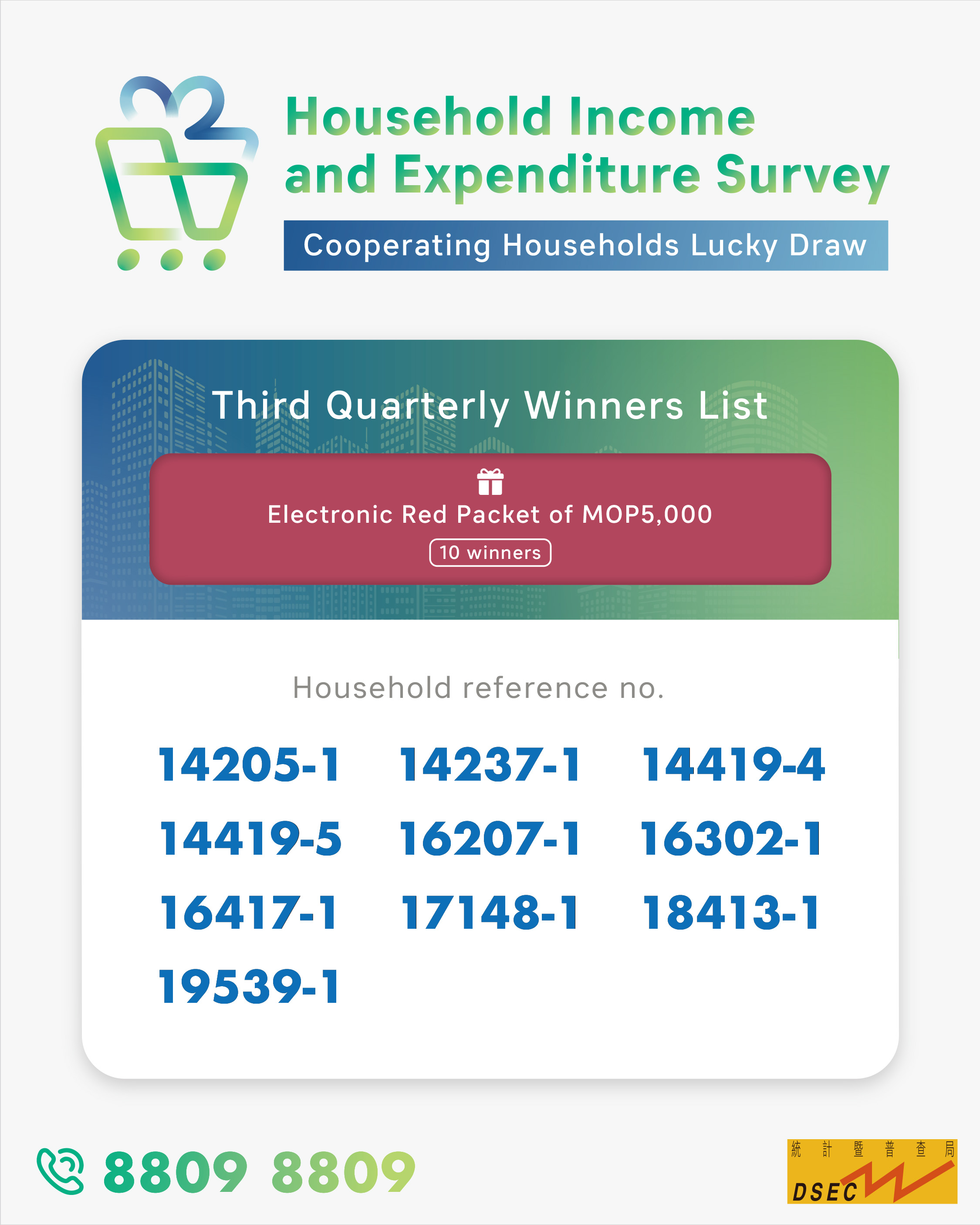 In appreciation of the support and cooperation from the households, households that complete the online questionnaire will receive “Online Completion Incentives”. In addition, households that complete the survey, regardless of their submission method, will automatically enter the “Cooperating Households Lucky Draw” to win an electronic red packet of MOP5,000.