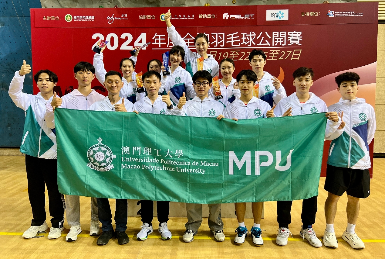 Co-organised by the Badminton Federation of Macau and Wynn Macau, the 2024 Macao Open Badminton Championships was held successfully. The Macao Polytechnic University Badminton Team demonstrated outstanding individual strength as well as stable teamwork, winning the championships in Women's Singles, Women's Doubles, Men's Doubles and Mixed Doubles. They also won the first runner-up in Mixed Doubles, achieving great success.
