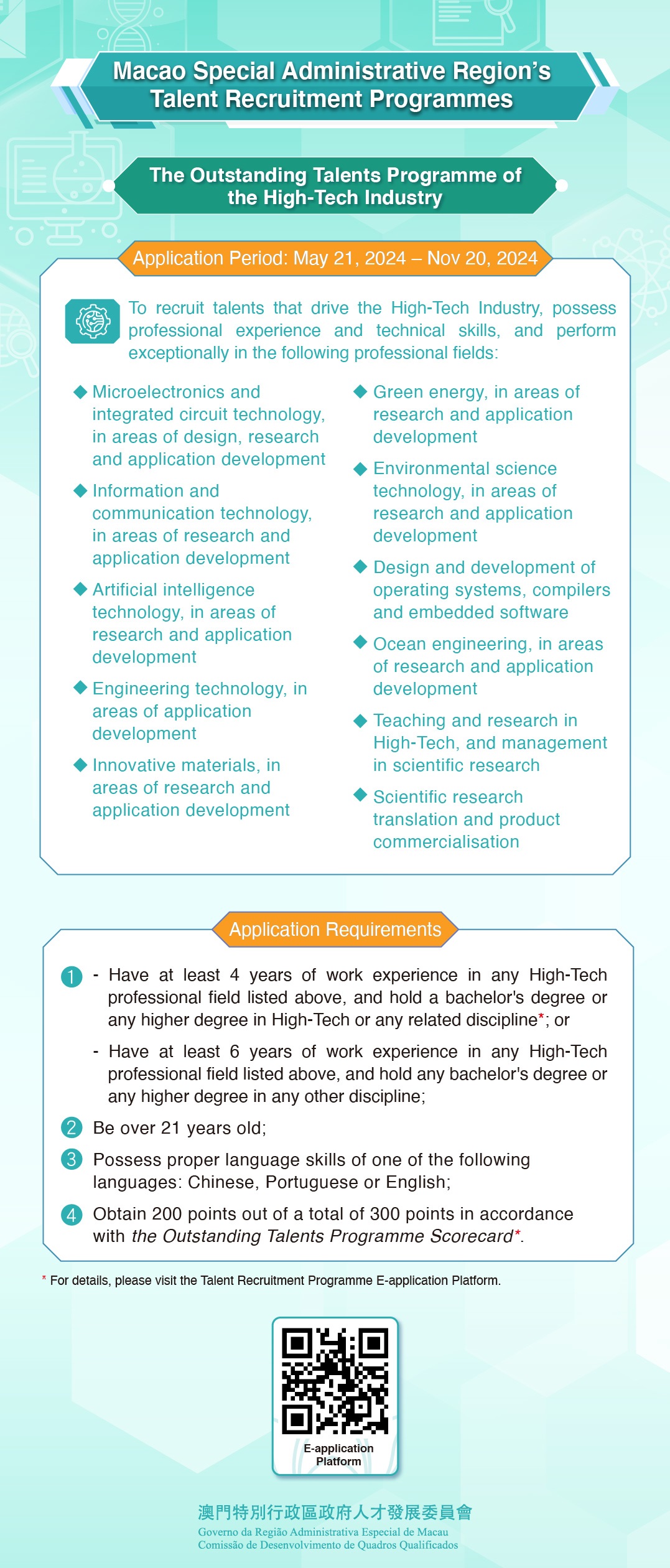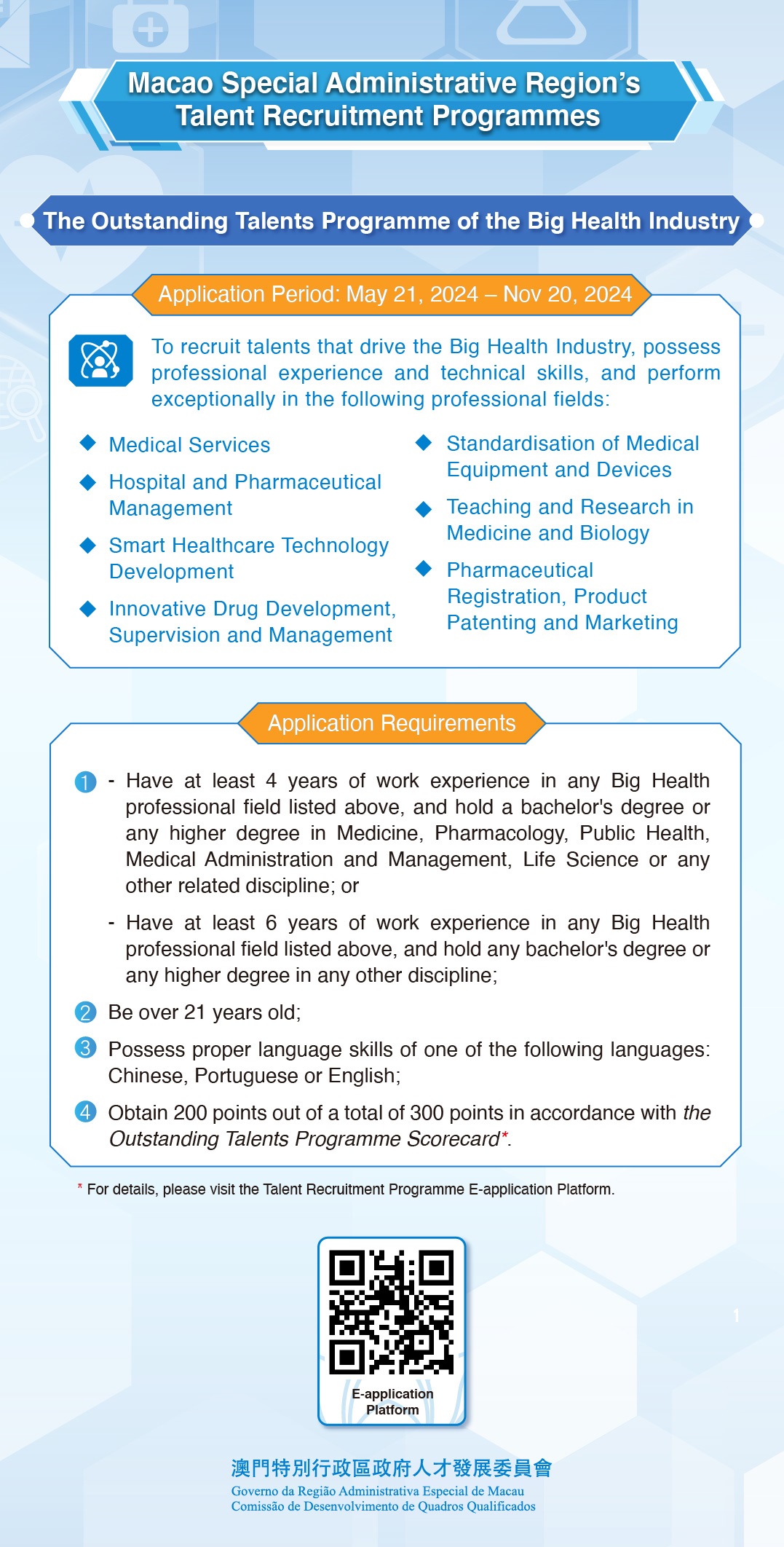 To facilitate the "1+4" strategy for the development of adequate economic diversification as well as further support local industries and sustainable social development, the Government of the Macao Special Administrative Region (SAR) launches its new round of talent recruitment programmes from May 21 to November 20, 2024. The 9 programmes include the High-end Talents Programme, the Outstanding Talents Programmes and the Advanced Professionals Programmes for the Big Health Industry, the High-Tech Industry, the Modern Finance Industry, as well as the Culture, Sports and Others Industries.