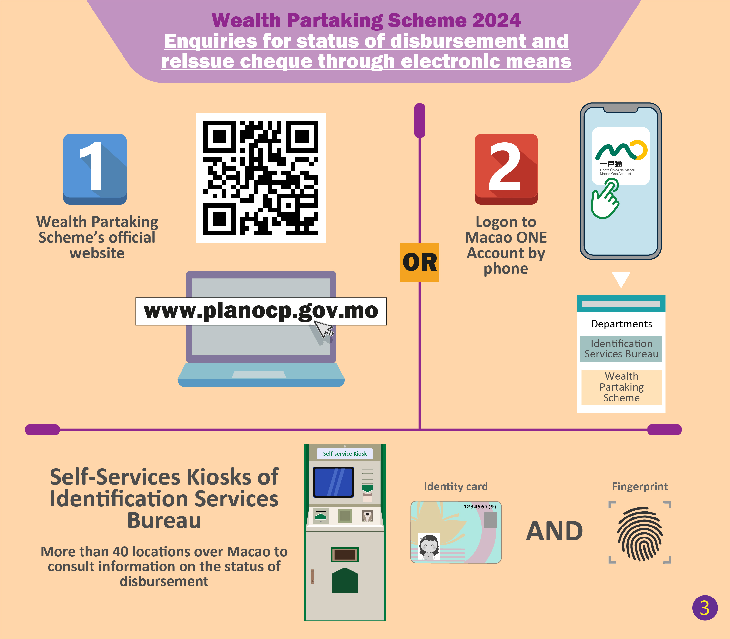 To facilitate the enquiries on the status of the Scheme, residents can enquire their personal disbursement information or the reason for not fulfilling the requirements of the Scheme through the Wealth Partaking Scheme’s official website (www.planocp.gov.mo) or logon to the Macao ONE Account. The status of disbursement can also be consulted through the Self-Services Kiosks of Identification Services Bureau at more than 40 locations over Macao, and basic information of the status will be shown after ID and fingerprint authentication.