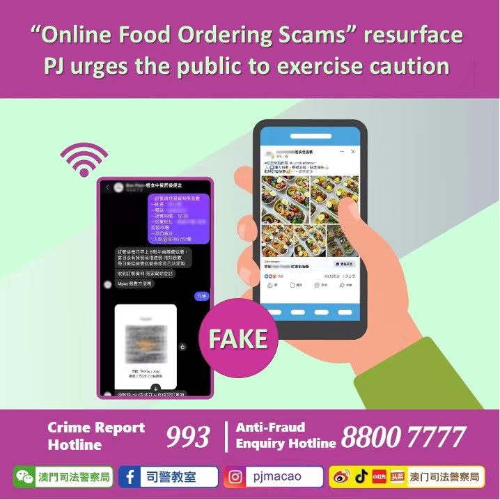 Recently, the Judiciary Police (PJ) has once again received reports of online food ordering scams. Fraudsters have set up social media pages offering "Chinese or Western light meal bento boxes" or "light, low-fat meals" ordering services, enticing consumers with discounts for orders in bulk or across multiple days. However, after victims placed orders and transferred hundreds to thousands of Macao Patacas via Mpay, they never received the meals and could not contact the sellers. The total losses reported by multiple victims exceeded six thousand Macao Patacas.