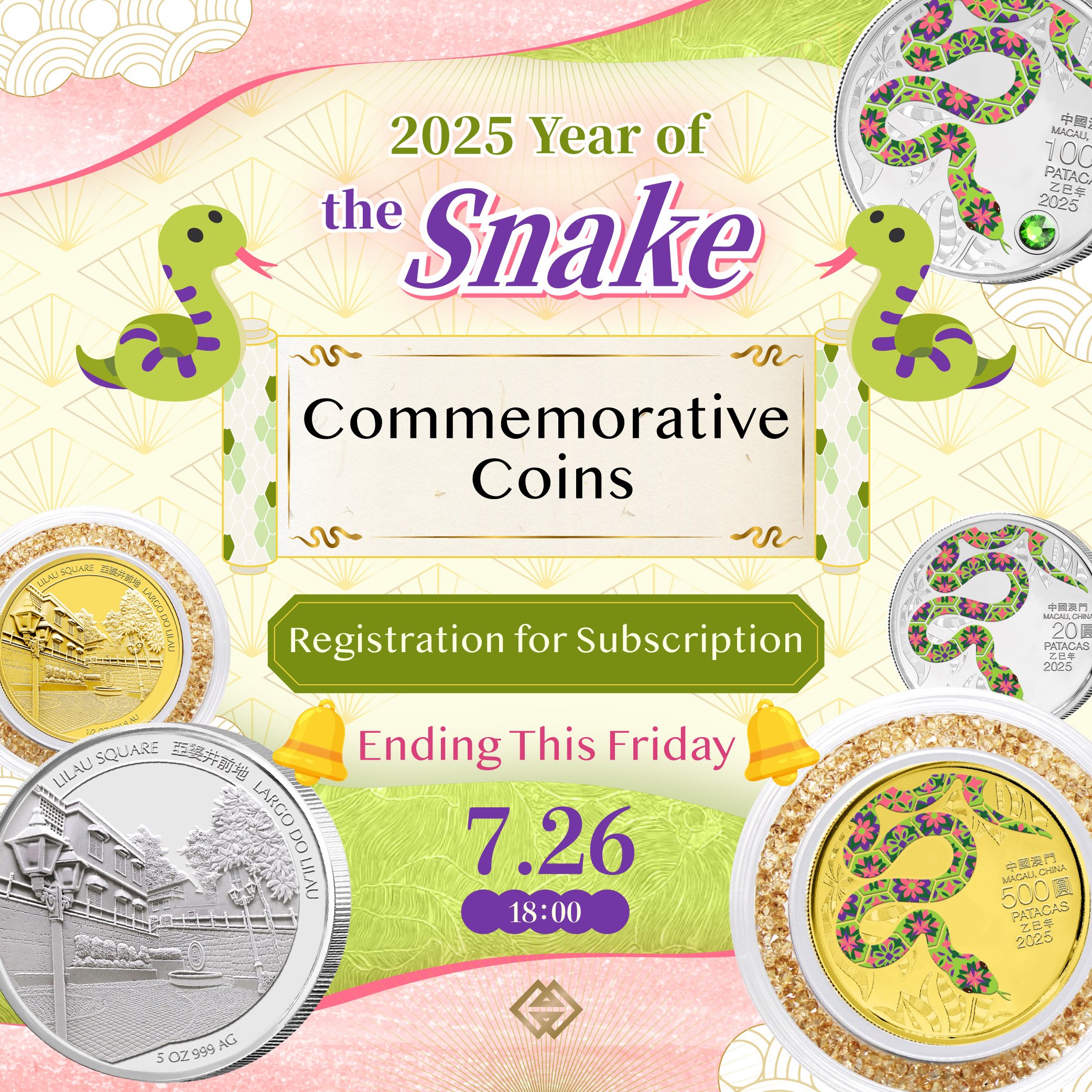 The online subscription period for the 2025 Year of the Snake commemorative coins will end at 6:00pm on 26 July 2024 (Friday). AMCM would like to remind Macao residents who are interested in subscribing for the said coins to complete the online subscription process before the mentioned deadline.