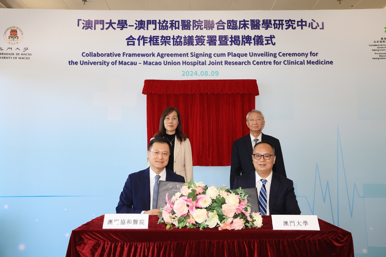 The University of Macau (UM) and the Islands Healthcare Complex – Macao Medical Center of Peking Union Medical College Hospital (Macao Union Hospital) today (9 August) signed a collaborative framework agreement and held a plaque unveiling ceremony for the University of Macau–Macao Union Hospital Joint Research Centre for Clinical Medicine. The joint research centre will actively promote innovative research in the fields of biomedicine, clinical medicine, critical diseases, Chinese medicine and ‘big health’, and train professionals in clinical medicine and other fields.