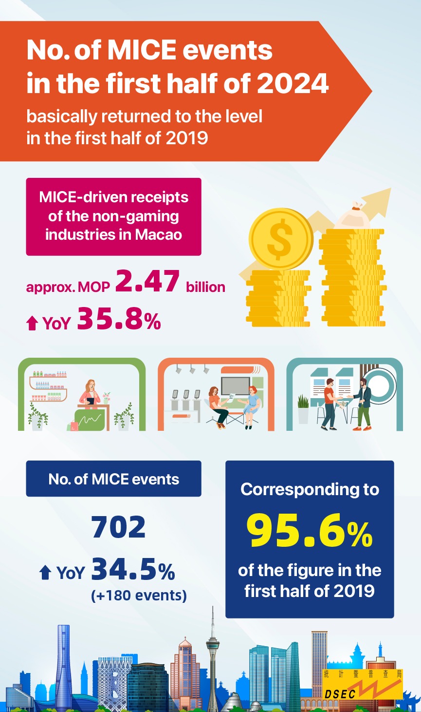 Information from the Statistics and Census Service (DSEC) indicated that number of MICE events rose by 34.5% (+180) year-on-year to 702 in the first half of 2024, corresponding to 95.6% of the figure in the same period in 2019 (734). MICE-driven receipts of the non-gaming industries in Macao were estimated at approximately MOP2.47 billion in the first half year, up by 35.8% from the first half of 2023 (MOP1.82 billion).