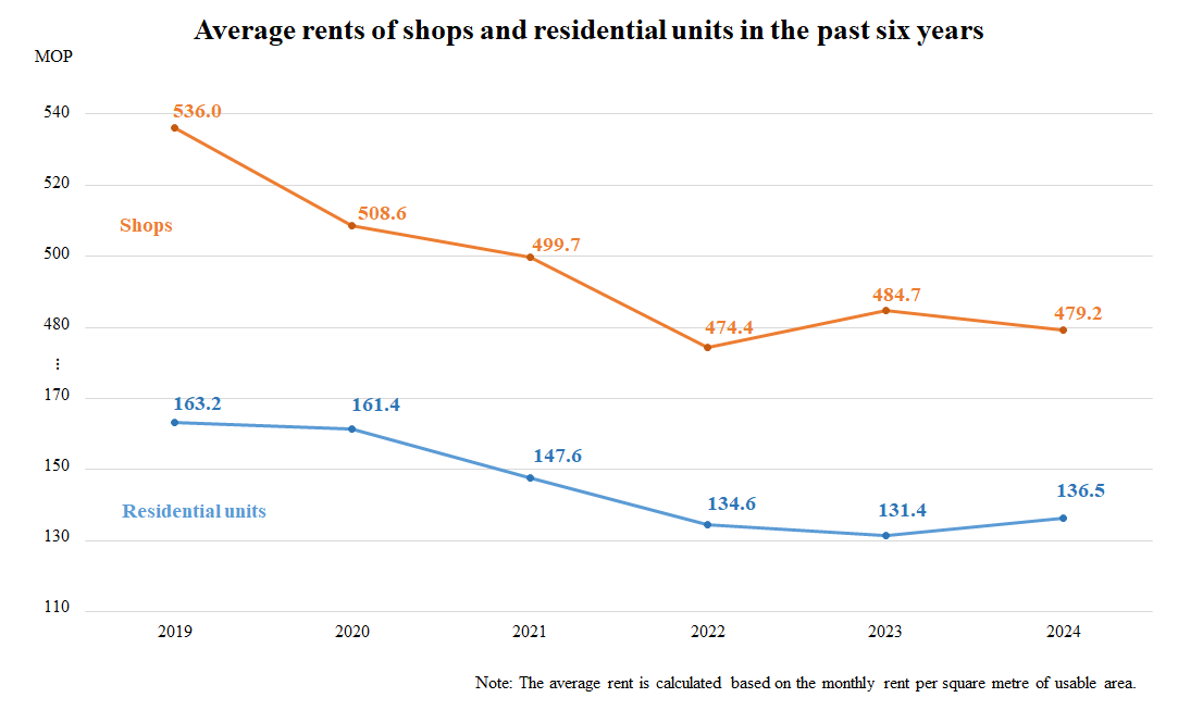 Analysed by quarter, the average rent for shops was MOP489 in the fourth quarter of 2024, down by 0.3% quarter-on-quarter. The average rents for office units (MOP293) and industrial units (MOP123) fell by 0.8% and 0.2% respectively quarter-on-quarter, while the average rent for residential units (MOP138) rose by 0.7%.