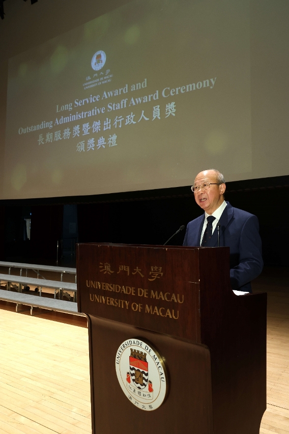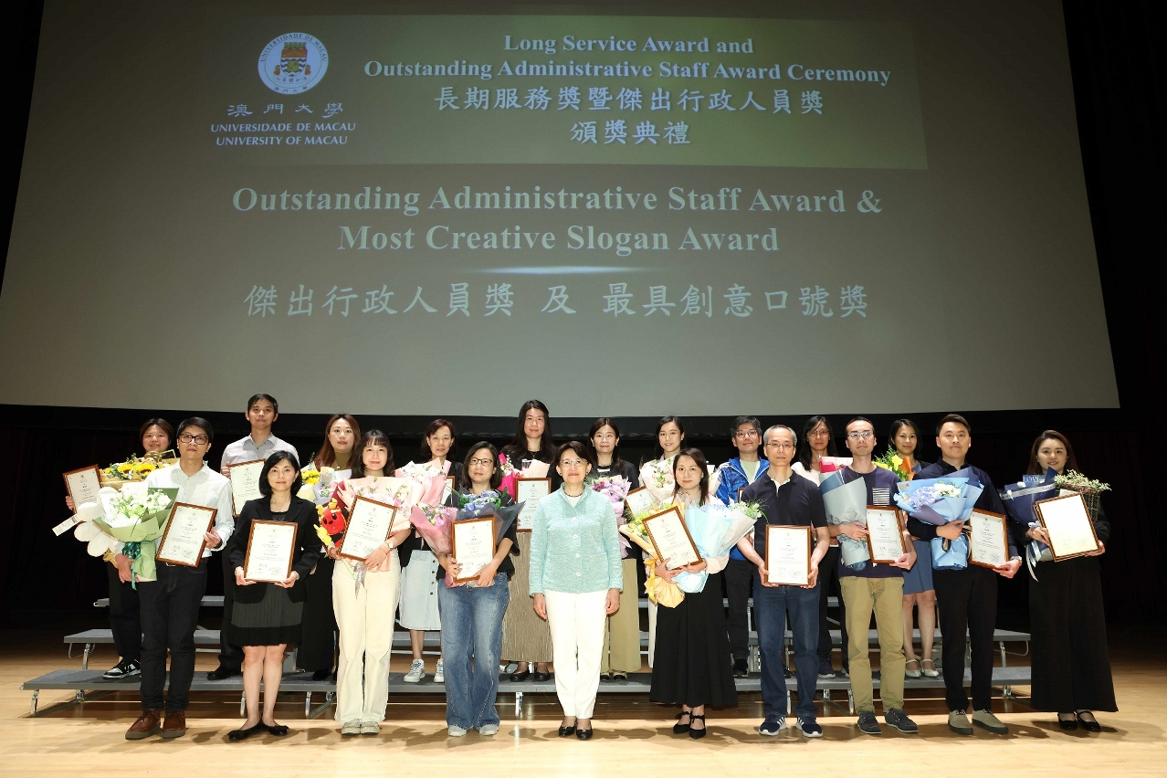 The University of Macau (UM) today (14 May) held the Long Service Award and Outstanding Administrative Staff Award Ceremony 2024 to honour the dedication and contributions of its faculty and staff. A total of 198 faculty and staff members were awarded Long Service Awards for reaching the milestones of 10, 15, 20, 25, 30, and 35 years of service. The Outstanding Administrative Staff Award and the Most Creative Slogan Award were also presented at the ceremony.