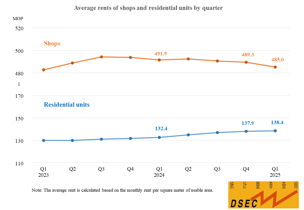Information from the Statistics and Census Service (DSEC) indicated that the average rent per square metre of usable area for shops in Macao was MOP485 in the first quarter of 2025, down by 0.9% quarter-on-quarter. The average rents for office units (MOP290) and industrial units (MOP123) went down by 1.3% and 0.2% respectively quarter-on-quarter, whereas the average rent for residential units (MOP138) increased by 0.4%.