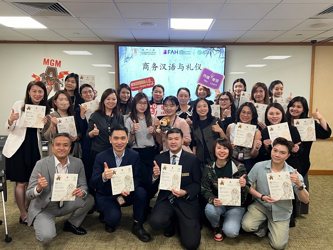 To support the integrated development of the Guangdong-Hong Kong-Macao Greater Bay Area, the Confucius Institute at the University of Macau (UM), at the invitation of MGM Macau, offered a training course on business Mandarin and etiquette to MGM staff. The course aimed to improve employees’ communication skills in Mandarin and their professional etiquette.