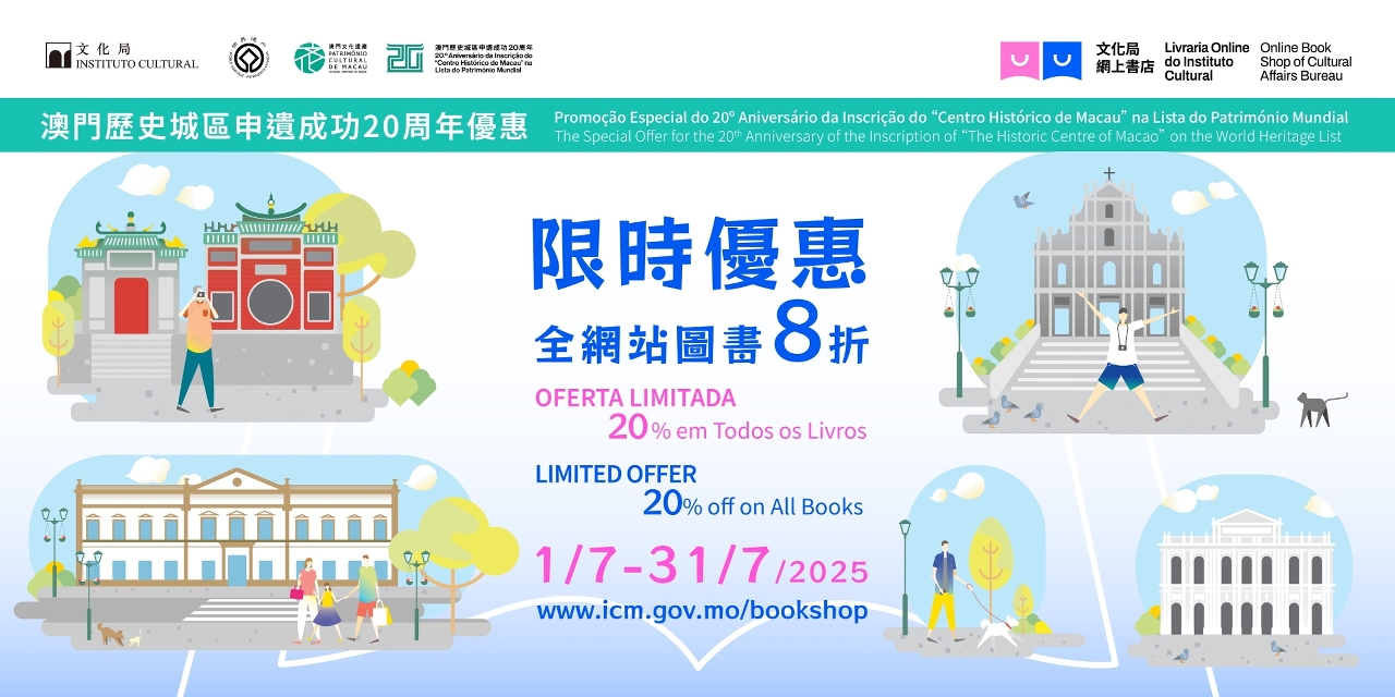 In order to celebrate the 20th anniversary of the inscription of the “Historic Centre of Macao” on the World Heritage List, the Online Book Shop of the Cultural Affairs Bureau (IC, from the Portuguese acronym) will launch special offers from 1 to 31 July this year. Readers may enjoy a 20% discount on all books on the website, as well as 50% and 10% discount on back issues and recent issues of the Review of Culture, respectively. In addition, readers may receive a complimentary set of the “Strolling through the World Heritage sites – Postcard Collection of the Historic Centre of Macao” on any book purchase on the Online Book Shop (by each transaction) during the abovementioned period. The gifts are available while stocks last.