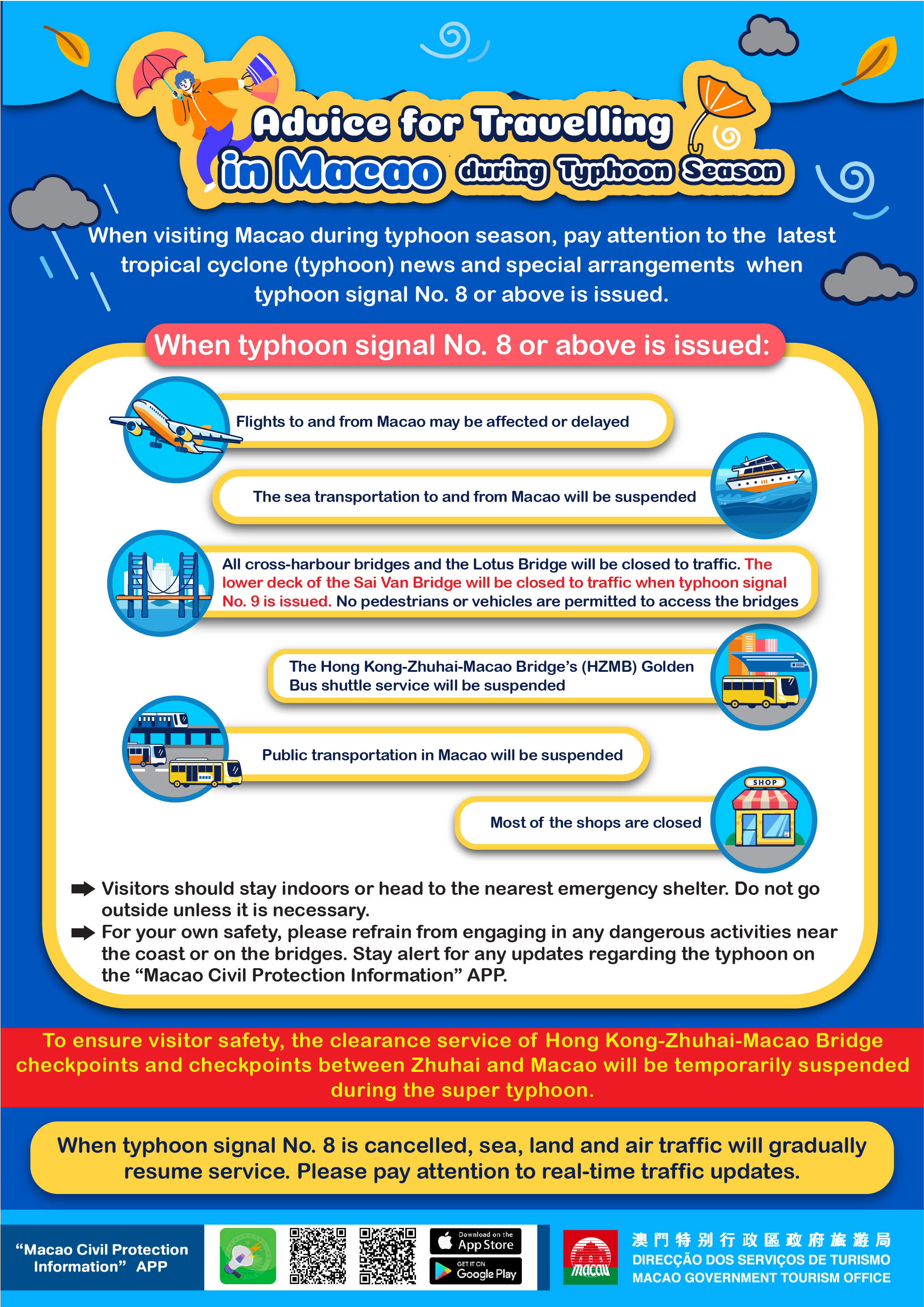 Typhoon information is on noticeable display at MGTO’s Tourist Information counters. Via telecommunication companies, the Office has sent civil protection information to visitors in Macao and Macao residents travelling abroad by mobile text.The latest weather news is forwarded for post on MGTO’s website and social media platforms as well. Tourism Hotline (2833 3000)operates 24 hours a day.