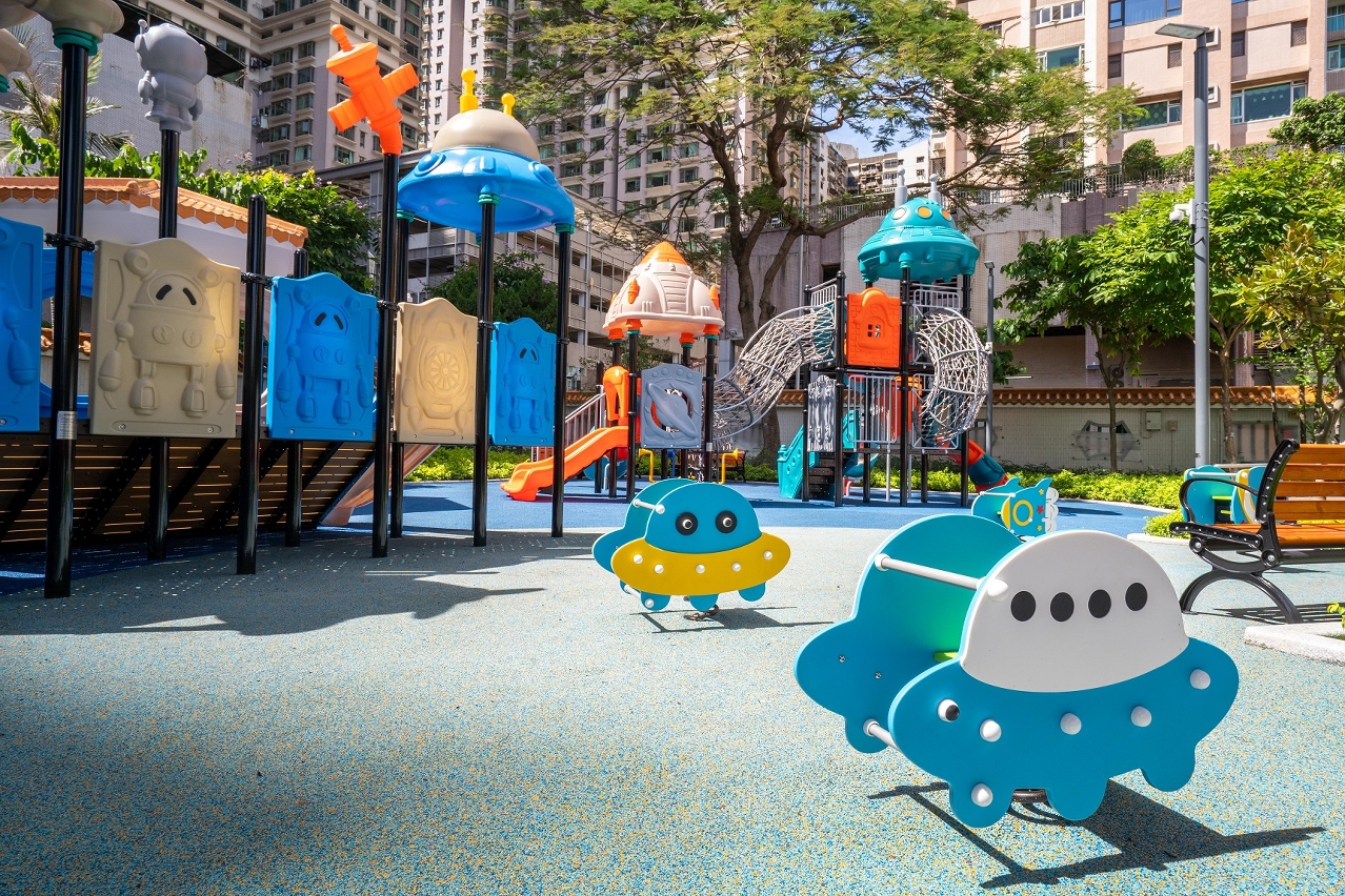 The children’s playground in Flower City Park is about 490 square metres in area, and the facilities and mats showed signs of ageing after years of use. During the optimisation and reorganisation this time, play facilities suitable for use by children aged 2 to 12 are installed, including climbing and balance play equipment, slides, swings and others, providing children of appropriate age with diversified play facilities. Meanwhile, the playground is paved with seamless safety mats with addition of washbasins for children and barrier-free access to connect the children’s playground and the activity room of Flower City Park to optimise the leisure activity space for the public. The playground has reopened for children to have fun.
