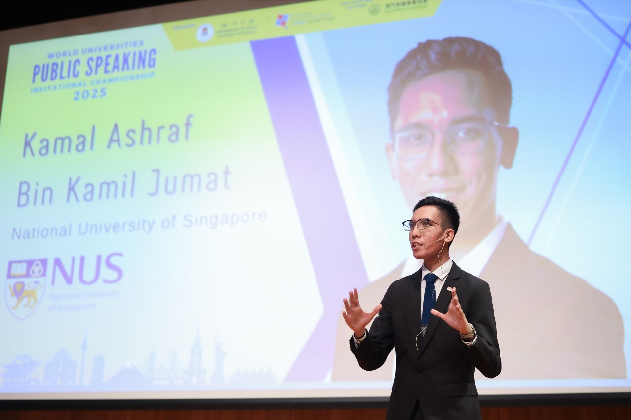 The University of Macau (UM) hosted the World Universities Public Speaking Invitational Championship 2025. The contest brought together students from 11 prestigious universities worldwide to showcase their exceptional English public speaking skills and promote cross-cultural exchange. After being assessed by an international panel of judges, Kamal Ashraf Bin Kamil Jumat from the National University of Singapore won the championship. The 1st and 2nd runners-up were Sofia Lopez Castillo from the University of British Columbia and Benjamin Thomas from Stanford University respectively.