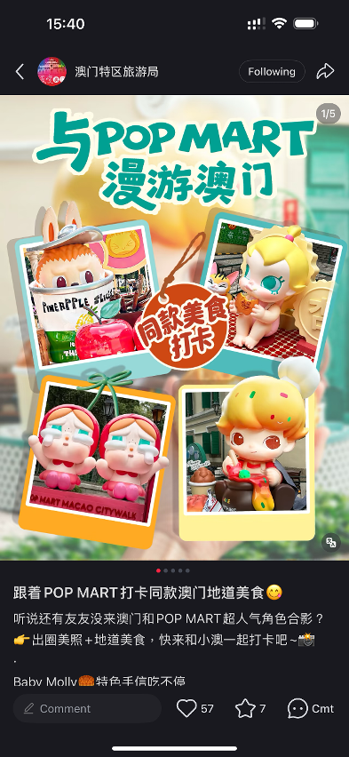 MGTO rolled out a diversity of promotional initiatives for POP MART MACAO CITYWALK. The project was spotlighted widely across the Office’s official platforms on social media such as WeChat, Weibo, Douyin, Xiaohongshu, TikTok, Facebook and Instagram as well as POP MART’s official Macao platform. The project was also spotlighted through live streams, videos, graphic and written posts by the Chinese Mainland KOLs. Over 450 posts and short videos were released cumulatively. The project garnered more than 90 million online impressions overall, which created hot travel topics about Macao worldwide and widened the reach into various visitor markets. In addition, the Office promoted the project through local TV stations, exterior bus advertisements and mega outdoor advertisements at various local ports of entry and Hong Kong International Airport, to elevate the project’s impact.