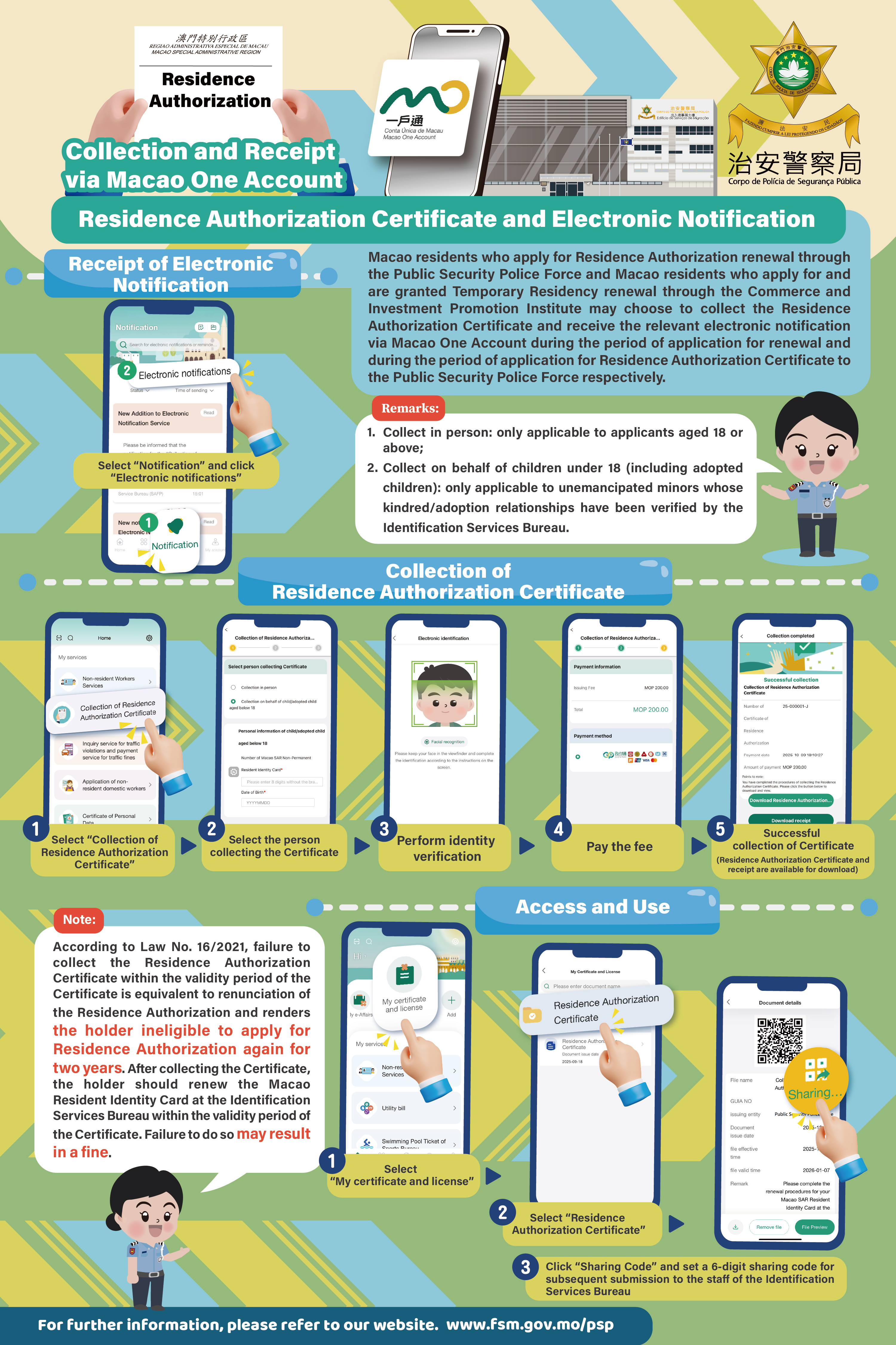 For detailed information about the collection of Residence Authorization Certificate, citizens may visit the website of the Public Security Police Force (www.fsm.gov.mo/psp), call the service hotline at 28725488 or send email to sminfo@fsm.gov.mo. As for information about the renewal of identity card, please visit the website of the Identification Services Bureau (www.dsi.gov.mo), call the hotlines at 28370777 or 28370888 or send email to info@dsi.gov.mo.