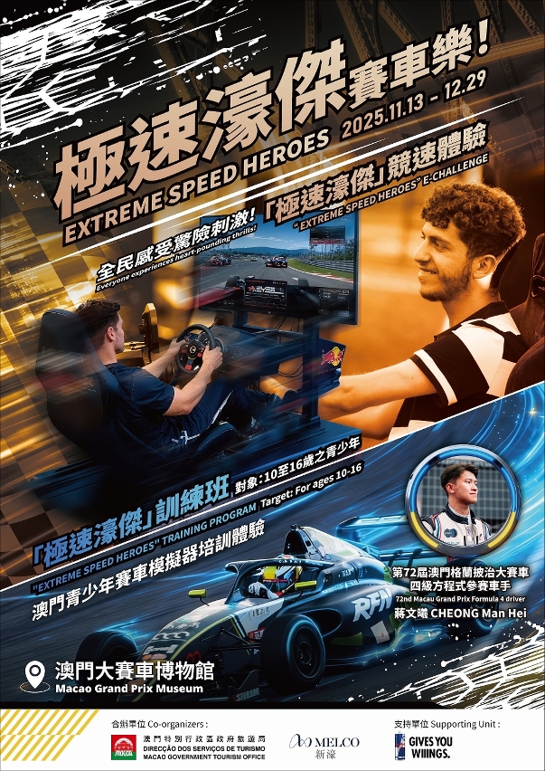 The Macao Grand Prix Museum (MGPM or the “Museum”) and Melco Resorts & Entertainment join hands to organize the event of “Extreme Speed Heroes”, in parallel with the 72nd Macau Grand Prix to be unveiled tomorrow (13 November). The event comprises the simulated racing training program and the simulated racing experience, for participants to experience and learn how to drive on motor-racing simulators. The offer of fun learning experience promotes the motorsport culture and radiates Macao’s blend of appeal in tourism and sports.