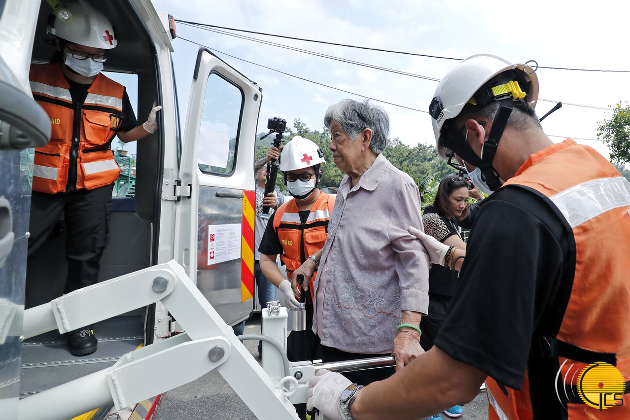 • Simulacro "Peixe Cristal" - durante a evacuação da zona de Coloane, pessoal do governo ajuda habitantes com prioridade por necessitarem de assistência com equipamentos médicos.