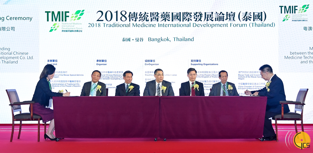 • Chefe do Executivo, Chui Sai On, testemunha assinatura do memorando de cooperação e acordo-quadro entre a Guangdong-Macau Traditional Chinese Medicine Technology Industrial Park Development Co., Ltd. e respectivos parceiros, durante o «Fórum Internacional de Desenvolvimento da Medicina Tradicional 2018 (Tailândia)», no âmbito da visita a Banguecoque, capital tailandesa.